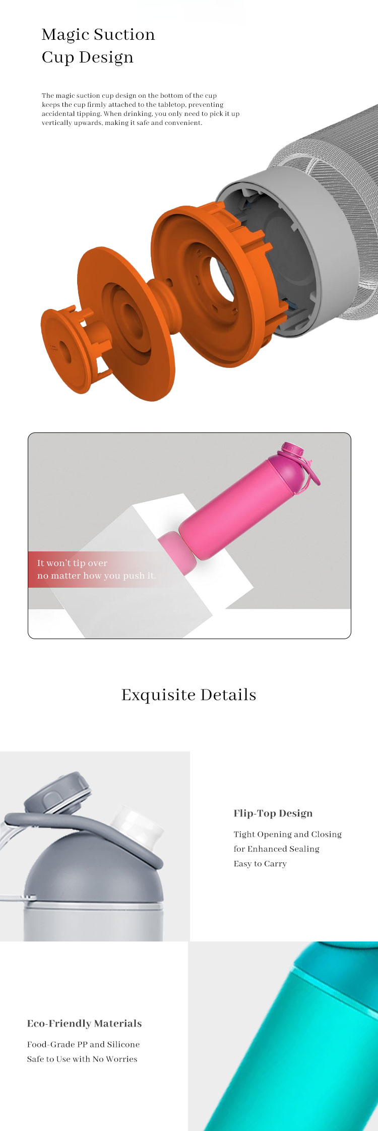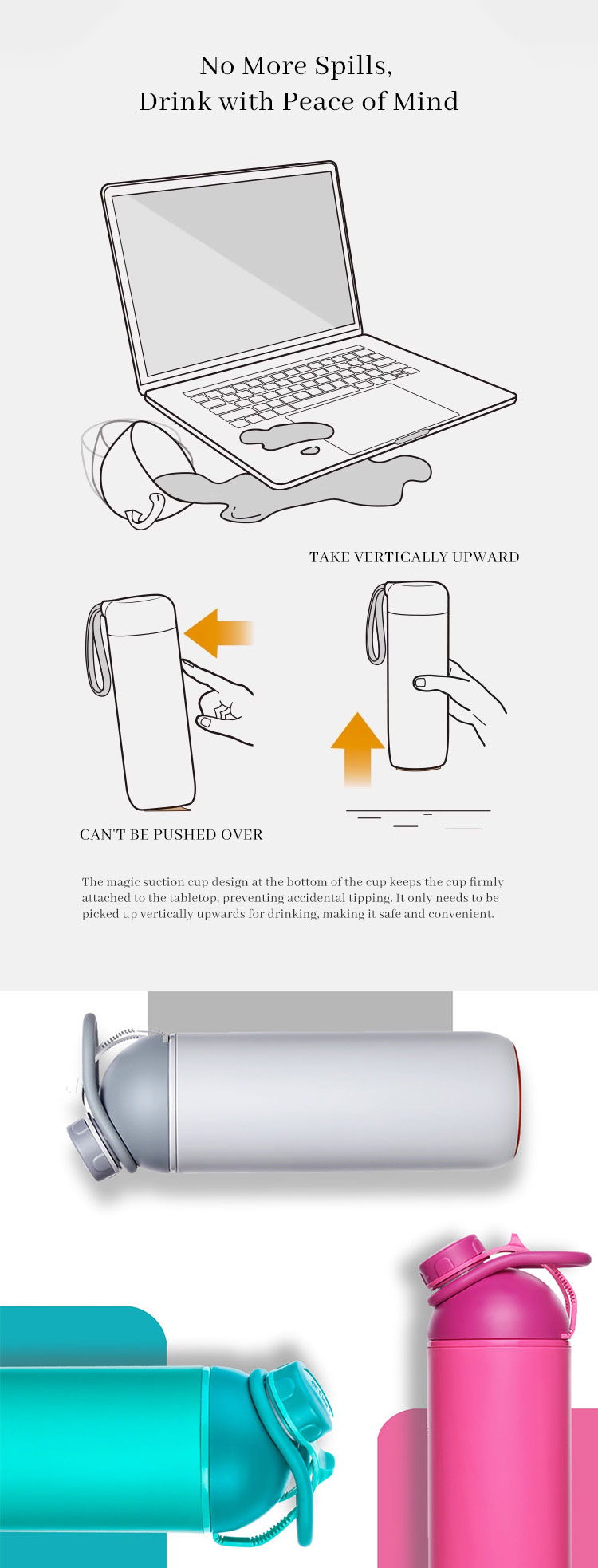 • Innovative magic suction cup non-tipping technology to prevent spills
