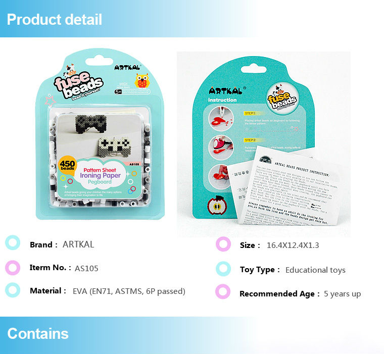 Each set includes: 450 beads; 1pc S pegboard; 1 plastic nipper; 1pc ironing paper; pattern and accessories.