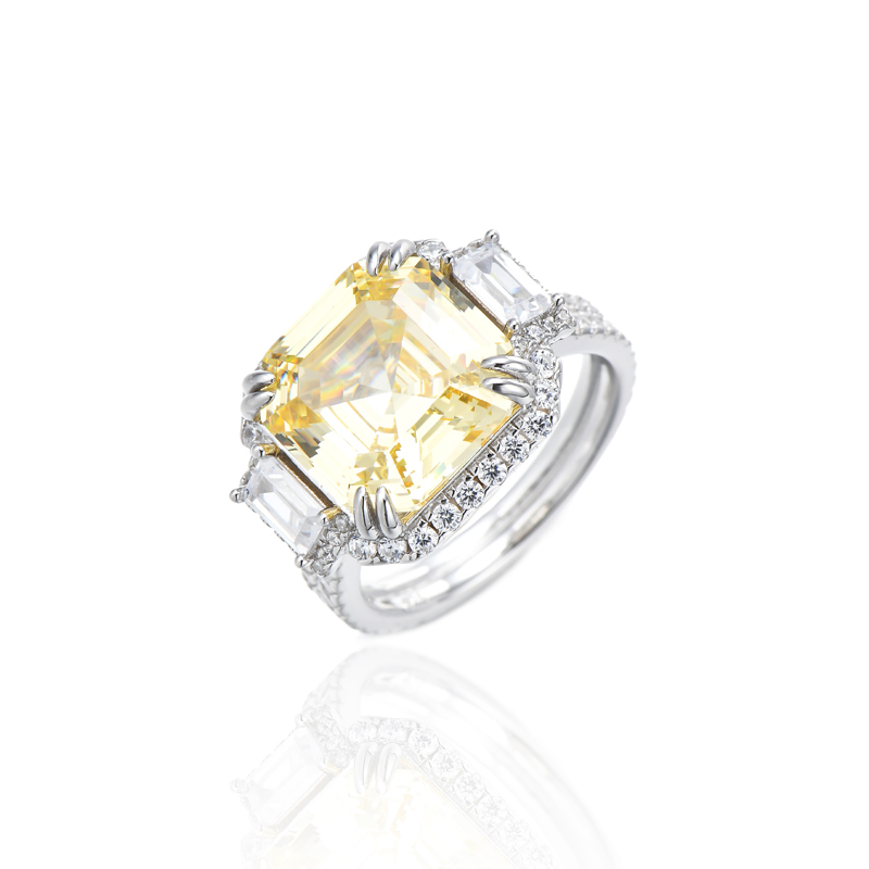 Asscher Canary And White Cubic Zircon Rhodium Silver Ring