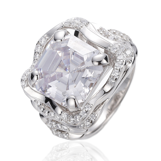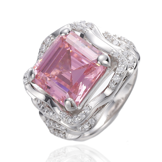 Asscher Diamond Pink And Round White Cubic Zircon Rhodium Silver Ring