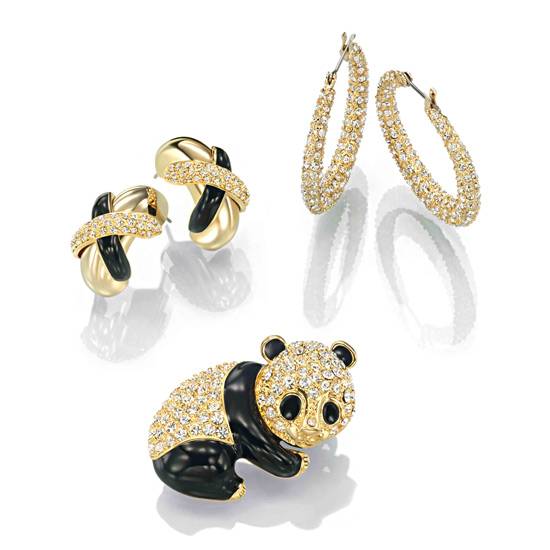 These are assorted pieces of jewelery. This deluxe set features ear rings, bracelets, and a panda pin. Each golden piece is adorned with hundreds of diamonds and fitted with jet black complimenting stones.