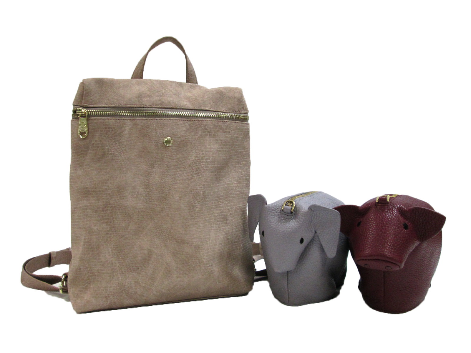 JFW1058-PU (backpack); JFW1009-LPG (Sheep purse); JFW1007-LPG (Pig purse)