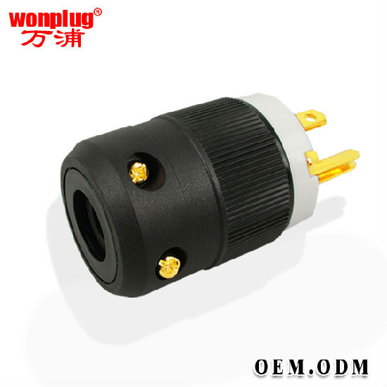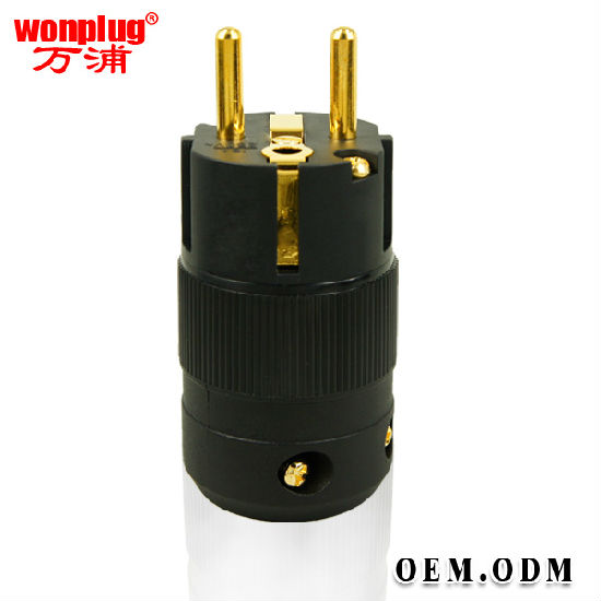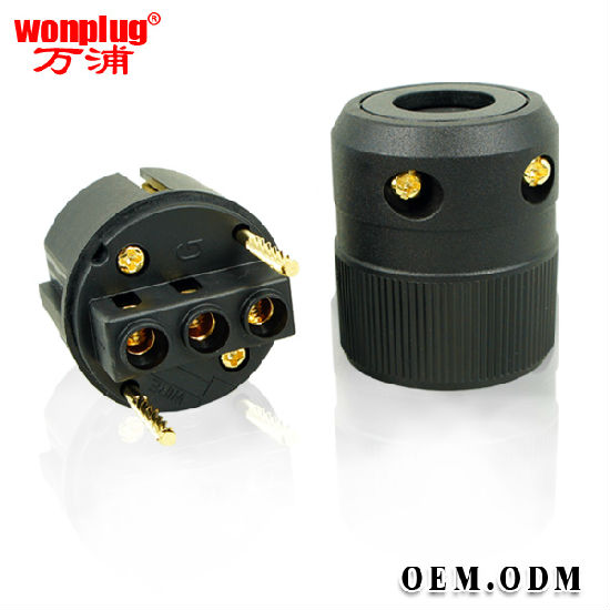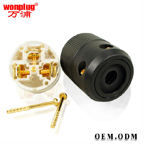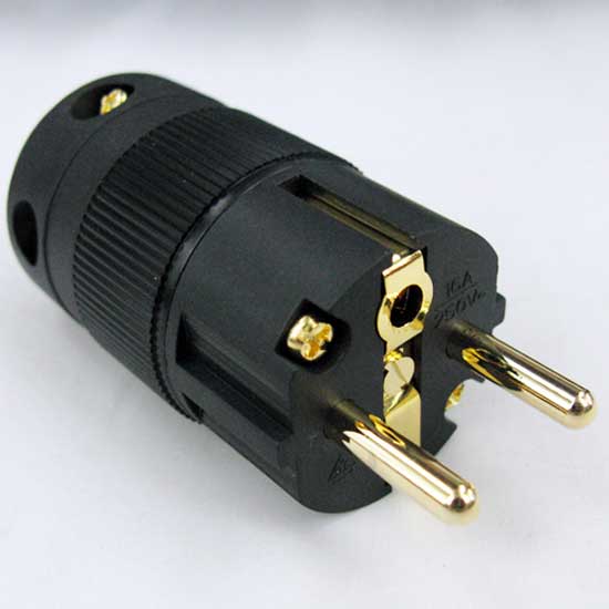 Shown here is an audio plug with copper parts. It is housed in an insulated casing in a cool black color. This audio plug is characterized by a robust mechanism.
