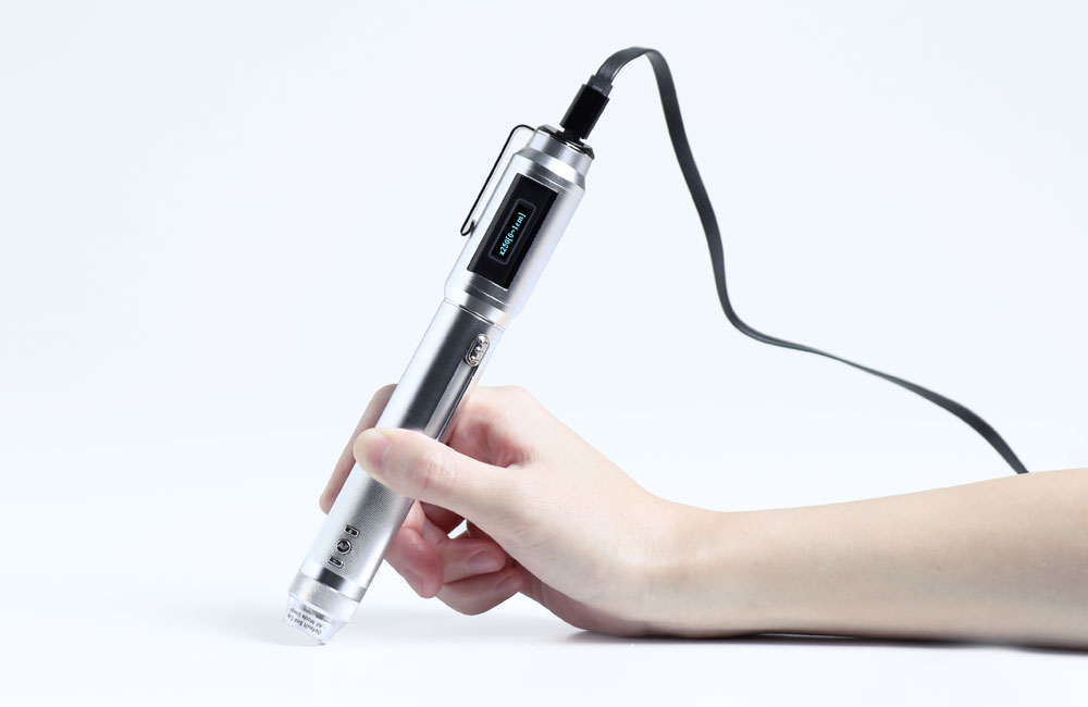 The magnification can be easily adjusted to four levels: 40x, 100x, 180x, and 250x using a switch. To set the magnification, simply set the switch and adjust the distance from the object. You can easily switch from low to high magnification without changing lenses. The working distance is displayed on the main unit display for each magnification.