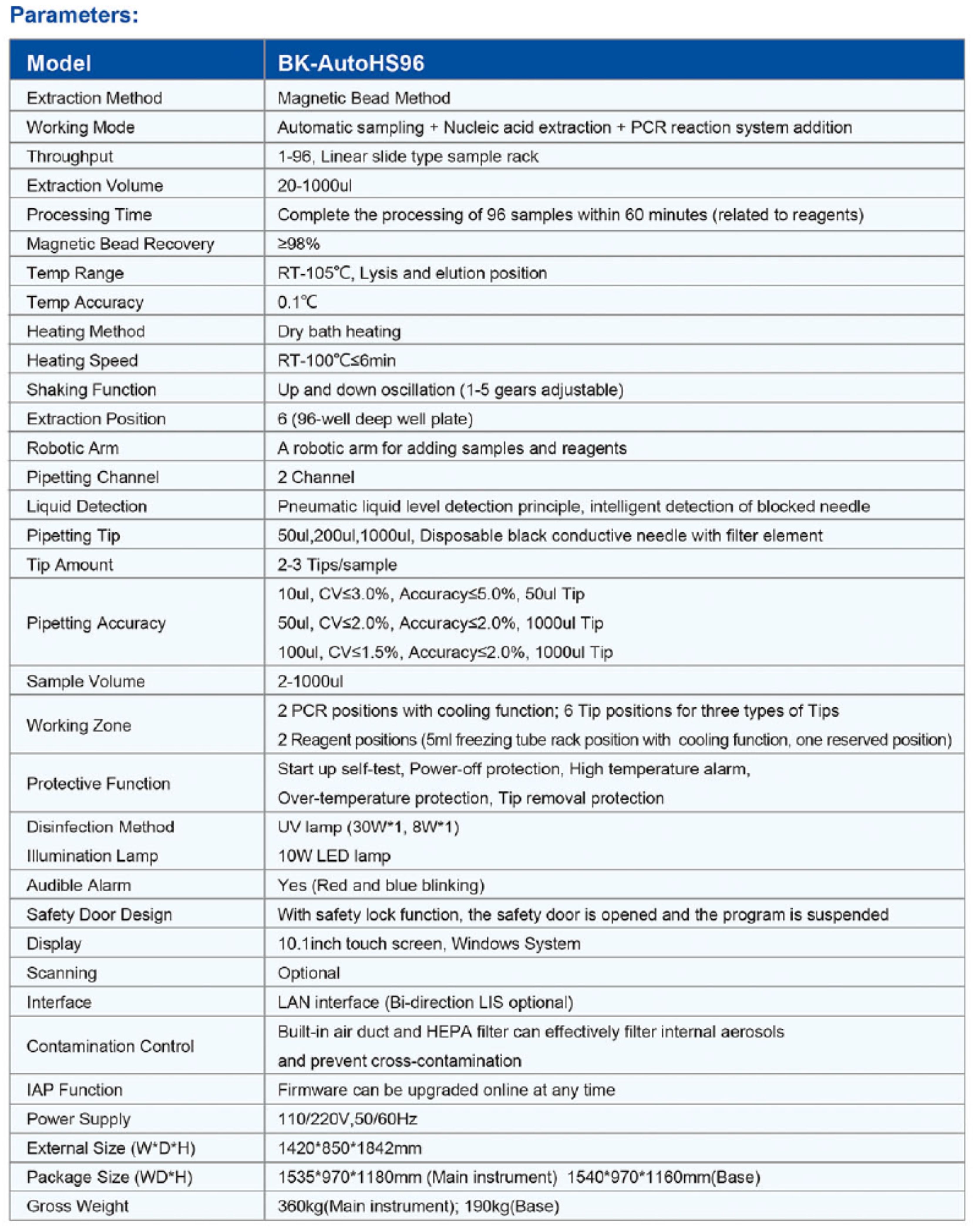 BK-Auto HS96 Automatic Nucleic Acid Extraction System is a fully automatic high-throughput equipment with automatic sample addition, nucleic acid extraction and PCR system configuration. With magnetic bead extraction reagents, it is suitable for aromatic nucleic acid extraction and purification of 1-96 clinical samples of various types. The flexible automatic liquid handling function can accurately complete sample loading and reagent distribution according to requirements. Humanized software design, simple operation, no manual steps, greatly improving work efficiency.