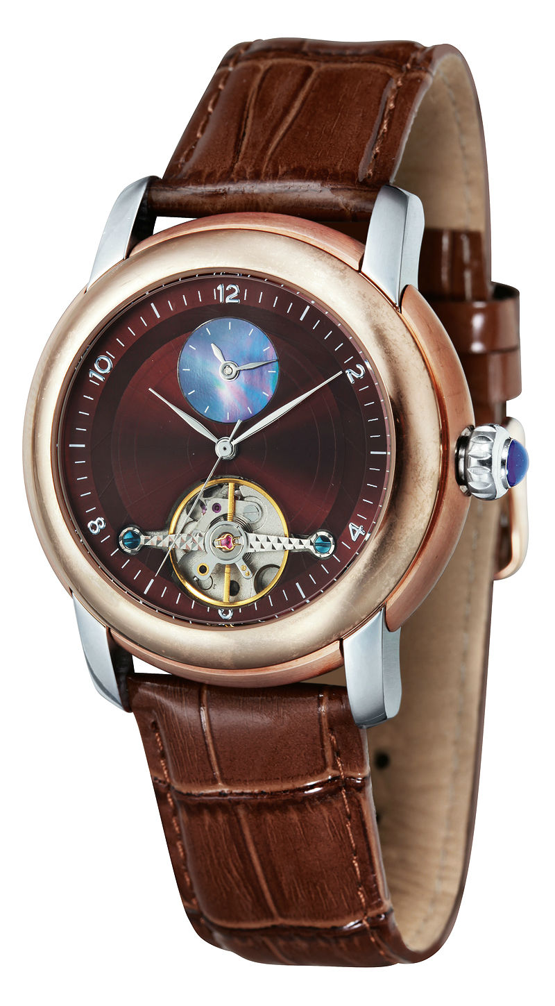 From the jeweled crown to the shimmery rose gold case, this analog watch instills a sense of class and luxury to your outfit. Exquisitely crafted, this superior watch features a beautifully pearlescent subdial and a skeleton subdial that reveals its intricate automatic movement. This deluxe timepiece is further set on a genuine leather strap for a premium look and feel.