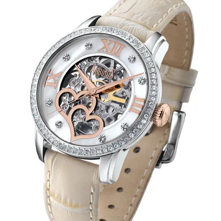 This mechanical ladies’ watch has a stainless steel case in round shape and is embellished with gemstones on the bezel. It has a skeleton dial with heart patterns for showing inner watch parts and has Roman numeral and gemstone hour indexes on the dial. Equipped with an automatic movement, this ladies’ watch flaunts outstanding precision and is perfect for matching a lovely look.