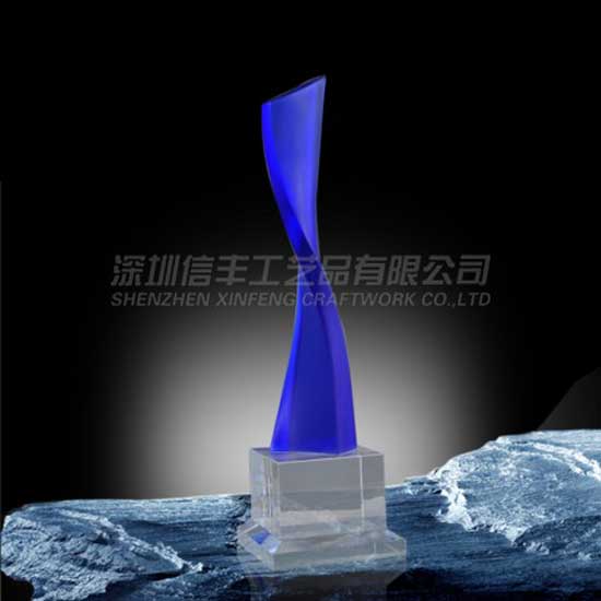 This elegant blue trophy features a curved shape with flowing lines. The trophy is designed with a clear base. It makes an excellent award and souvenir for parties, competitions and celebration events.