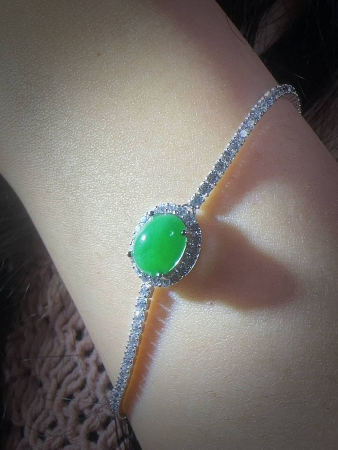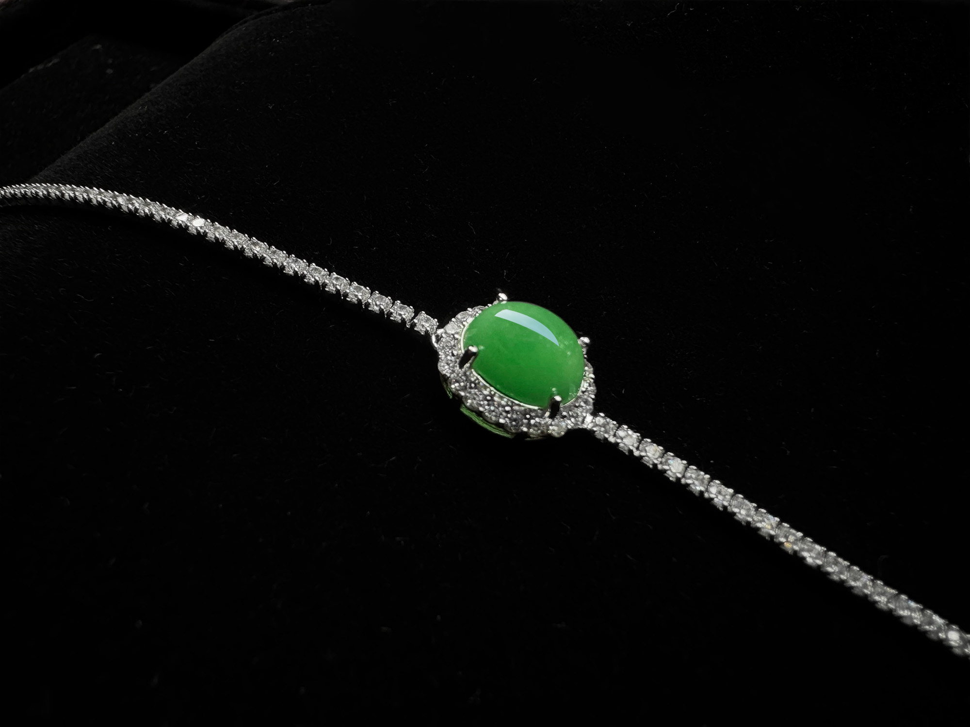 This striking tennis bracelet features a brilliantly cut, oval jadeite cabochon at its center, glowing with a rich, luminous green. The vibrant main stone is magnificently framed by a glittering diamond halo, seamlessly connecting to a delicate, fully paved diamond chain. This piece is a true emblem of sophisticated luxury and timeless grace.