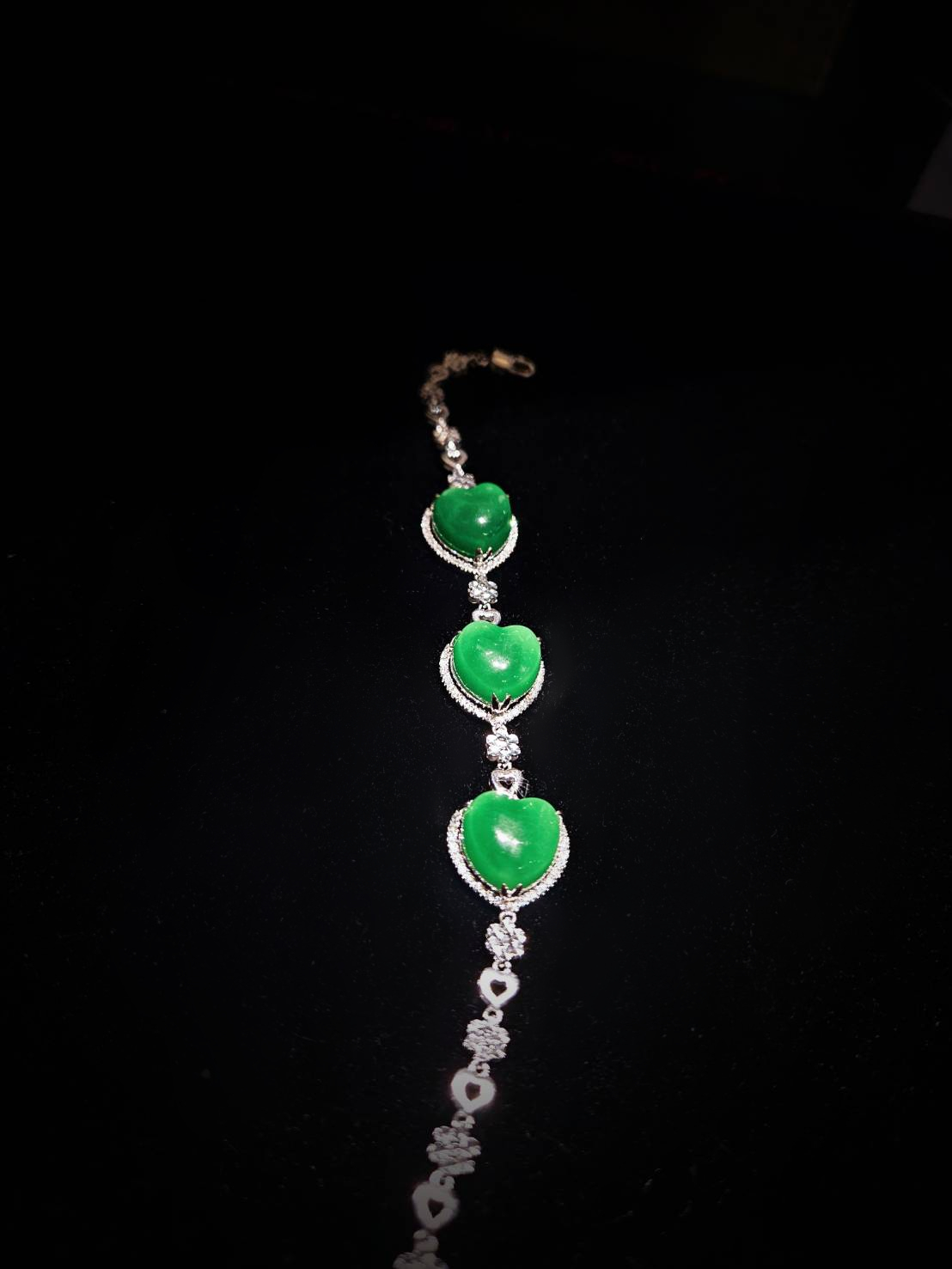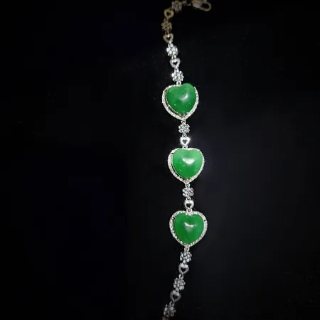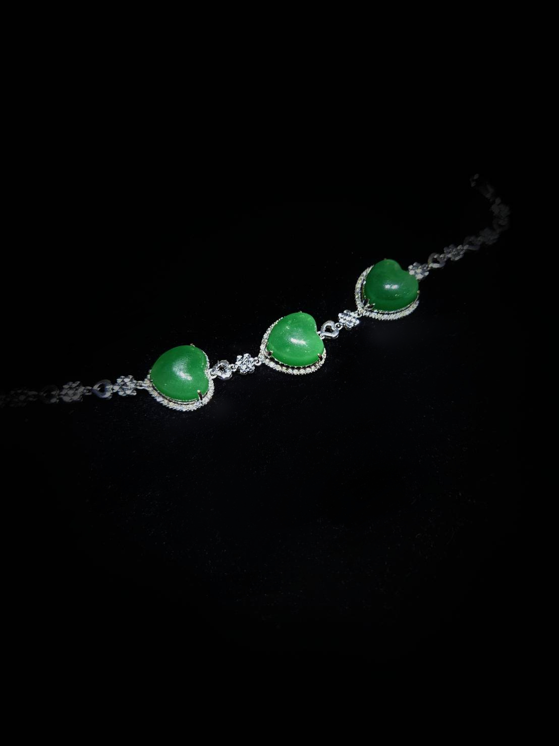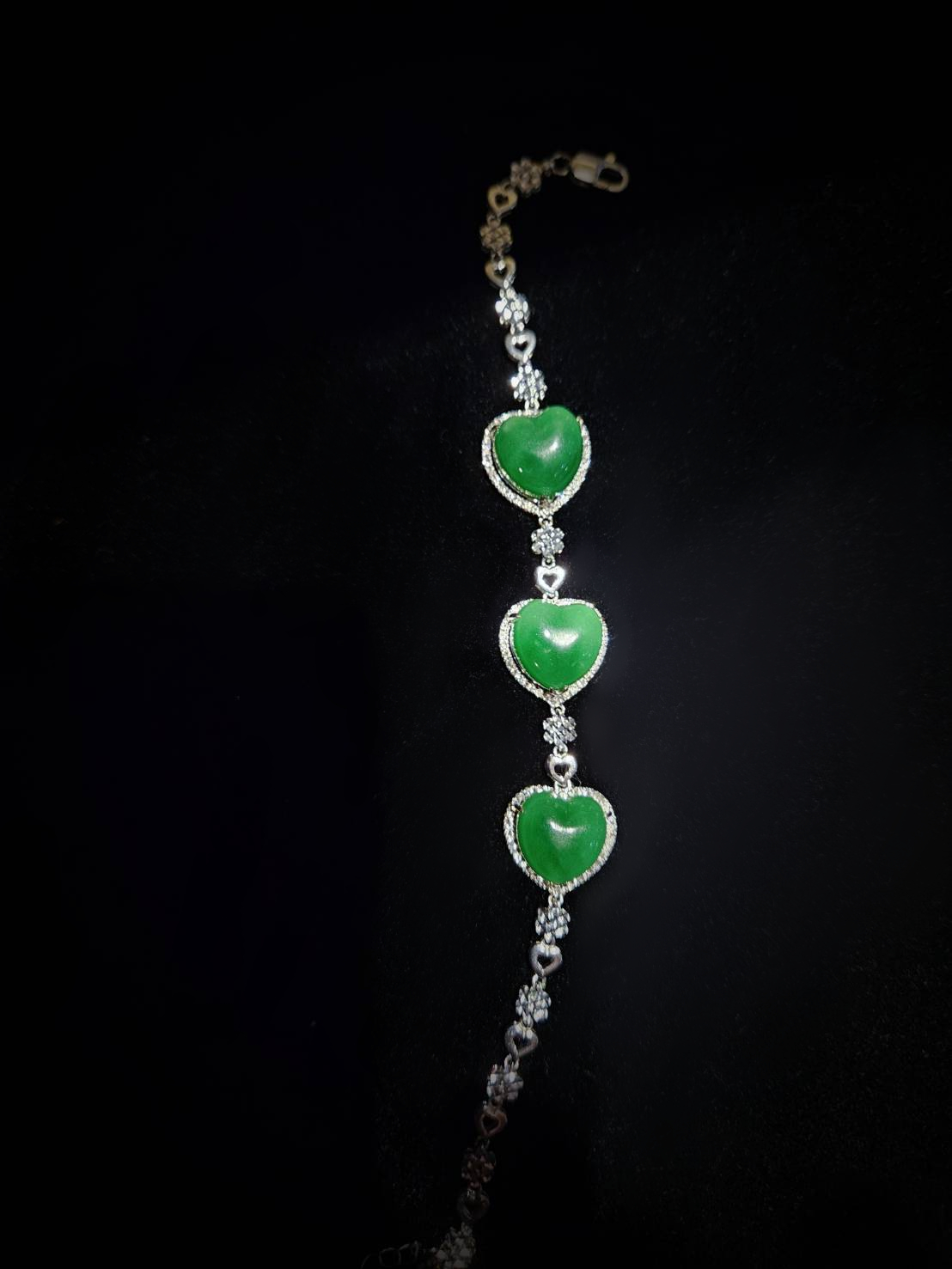 This charming bracelet is a celebration of romance, featuring three richly colored, heart-shaped jadeite cabochons that glow with natural luster. Each vibrant heart is exquisitely framed by a dazzling diamond halo, seamlessly linking to a delicate chain of sparkling, diamond-accented floral motifs, creating a piece that exudes both love and refined elegance.