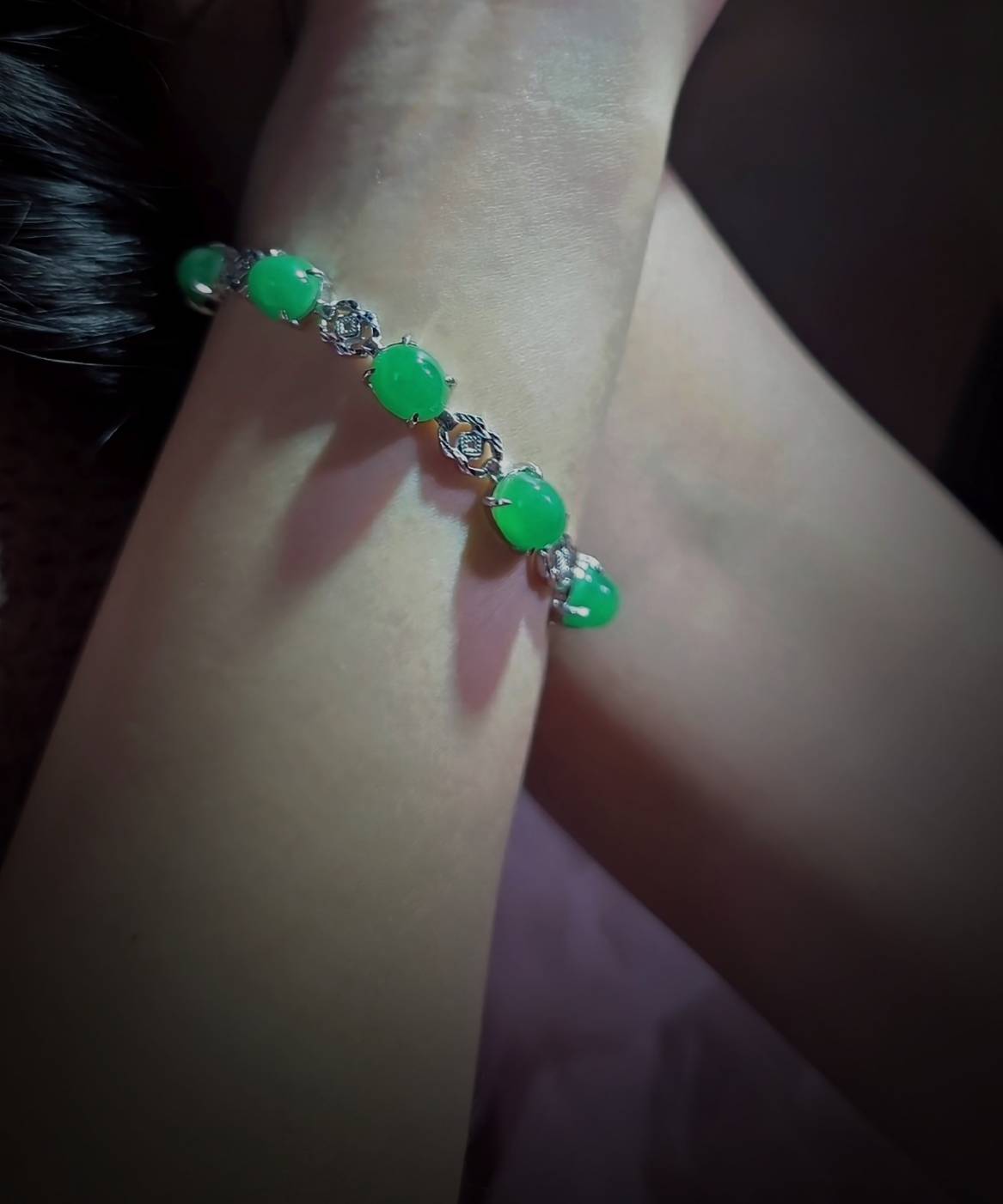 This delicate link bracelet features a captivating line of luminous, round jadeite cabochons, each glowing with a rich, vibrant green hue. Every jadeite stone is individually framed by an intricate, diamond-accented floral setting, creating a piece that beautifully harmonizes the tranquility of nature with the brilliant sparkle of fine craftsmanship. It is an emblem of grace and femininity.