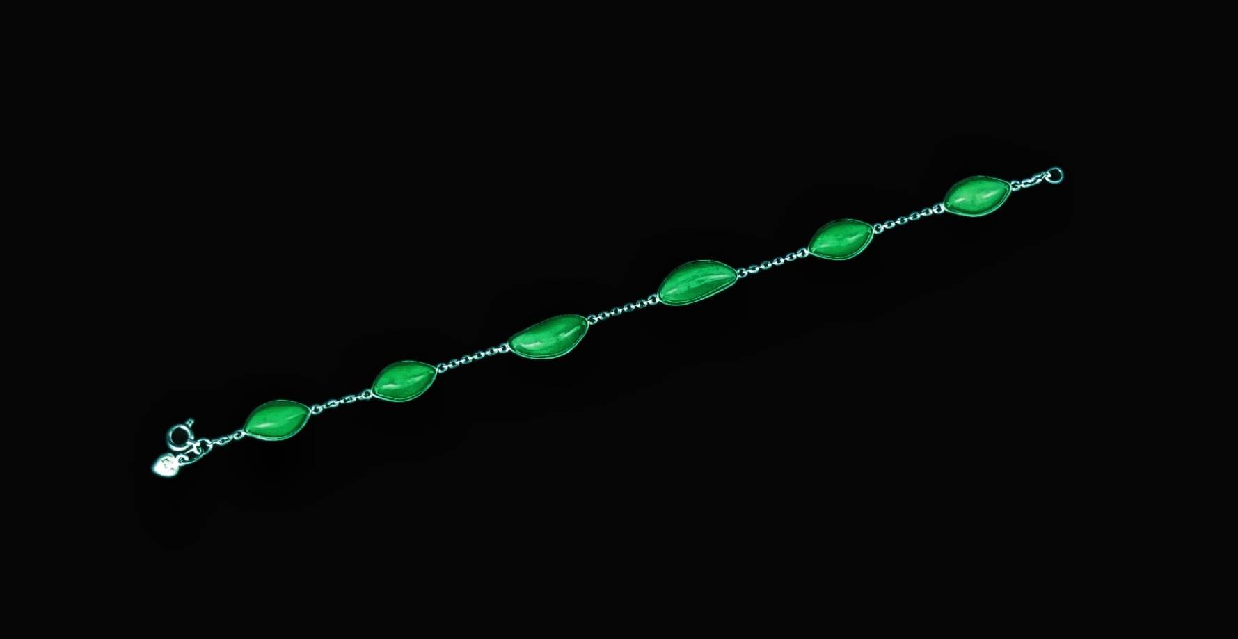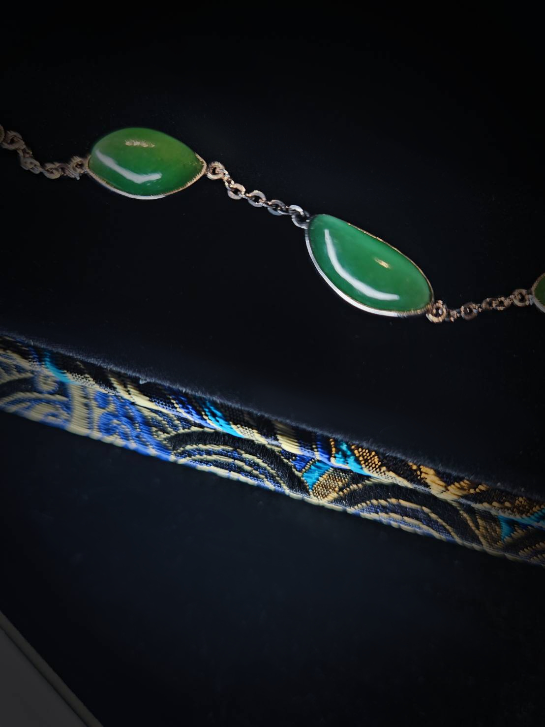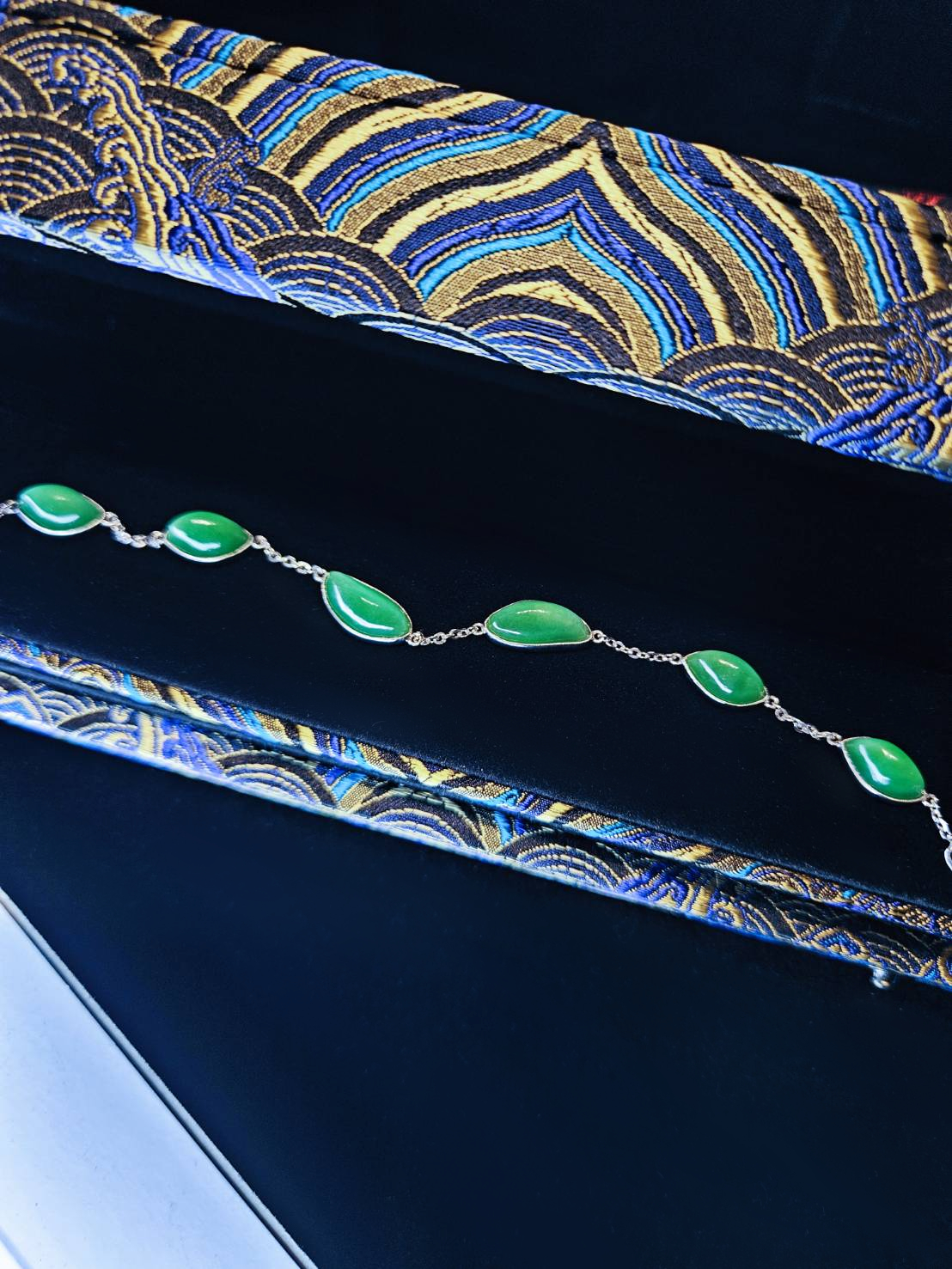 This exquisite link bracelet features a captivating series of oval, marquise-shaped jadeite cabochons, each displaying a rich, luminous green hue. The stones are delicately connected by fine metal links, creating a smooth, flowing piece that drapes gracefully on the wrist. It is a stunning display of natural beauty and understated elegance.