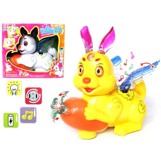 This unique B/O toy features the design of a cartoon rabbit with a pair of translucent wings. The toy rabbit is holding a carrot which is able to emit bright light from the green leaves. It can also generate pleasant music to entertain your kids.