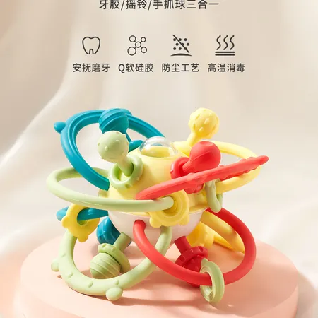 The toy combines silicone hand rope and silicone bite head function, can train the baby's hand grip function, while the design of multiple bite points can also solve the baby's oral period needs, shaking the top and bottom of the ring beads issued "sa sa" sound, more attractive to the baby's interest.