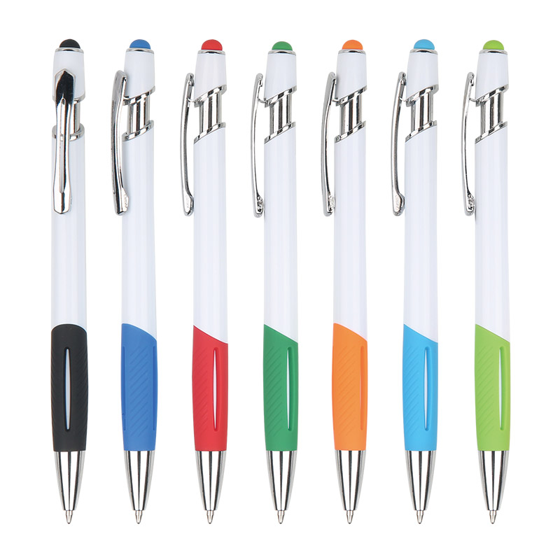 PUSH-ACTION STYLUS PEN, WHITE BARREL & CAP, COLORED RUBBER SLEEVE, METAL CLIP, CHROME PLASTIC PARTS, COLORED TOUCH TIP, FINE BALLPOINT REFILL.