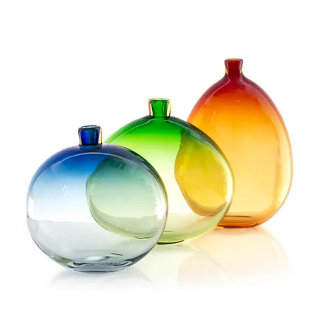 The Balloon Vase captures a moment of expansion, a vivid gradient of color holding the breath of the glassblower. A touch of amber at the neck is a finishing detail. A slim side profile is a surprising design element.