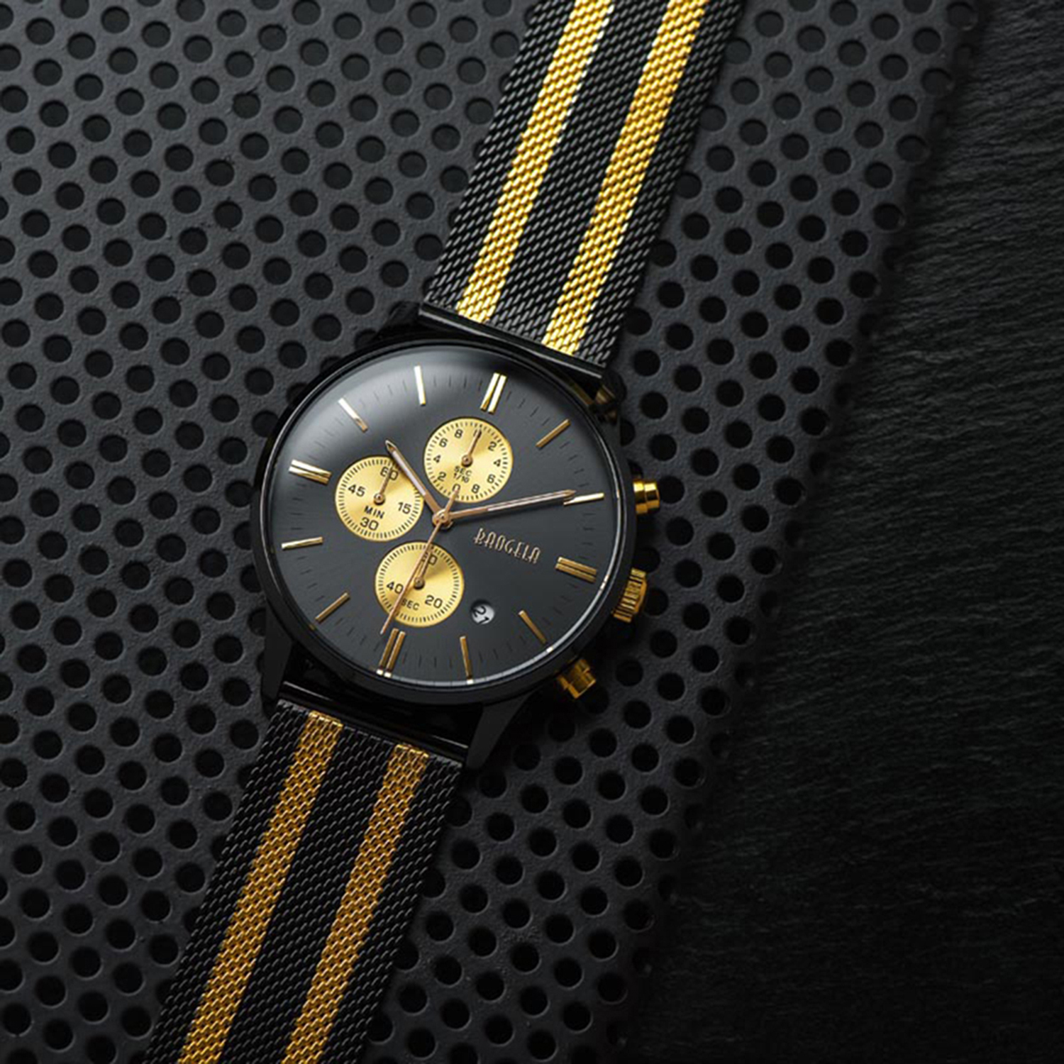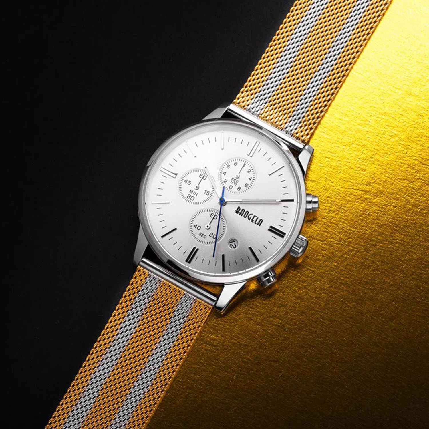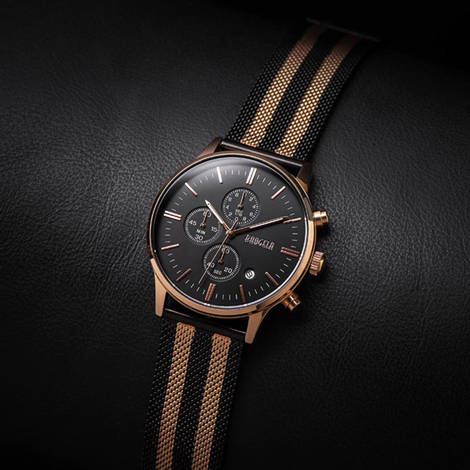 BAOGELA Chronograph Black New Watches Mens Quartz Watch Stainless Steel Mesh Band Slim Men Gold Watch