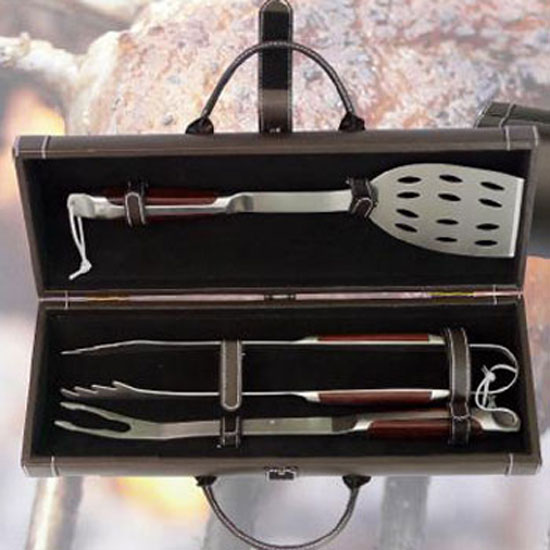 This BBQ tool set comes with 3 BBQ tools. They include a spatula, a BBQ fork and a pair of tongs. The case comes with a large handle for easy carrying.