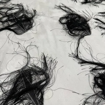 The BLACK STARS fabric offers excellent breathability, making it ideal for comfortable wear year-round. It features a soft texture that feels pleasant against the skin, providing a sense of coziness and comfort. Black four-pointed stars with hanging threads are embroidered onto a white base, creating a unique and stylish visual effect. These details add originality to the fabric, making it perfect for both casual and evening wear.