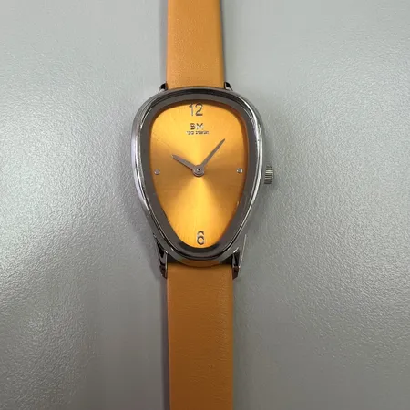 This watch has an asymmetrical, teardrop-shaped silver case with an orange dial. It features slim silver hands, with the numbers 12 and 6 marked, while small dots indicate the other hour positions. The brand "BM TIME DESIGN" is printed below the 12 o'clock mark. The strap is a matching orange leather.