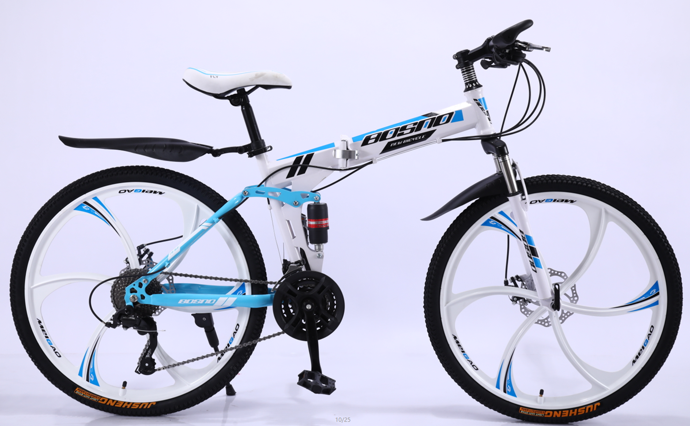 High carbon steel folding soft tail frame, sprayed inner sticker, double shock absorption, double disc brake, magnesium alloy integrated wheel, domestic transmission system (30 finger shift 50 rear derailleur), Hengqi/Huanyu/Jusheng 26×195 tires, natural rubber inner tube