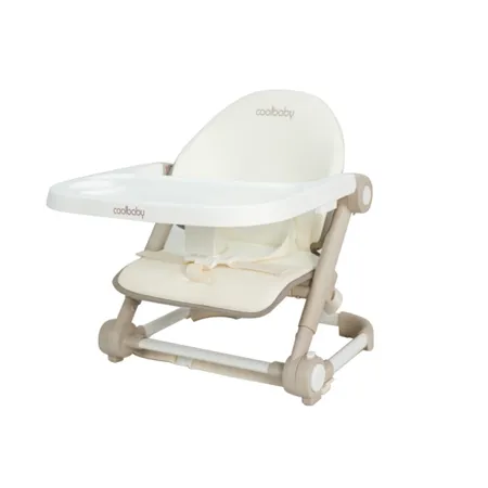 The booster chair features an ultra-compact folding design for storage and portability. Adjustable tray in 3 positions.