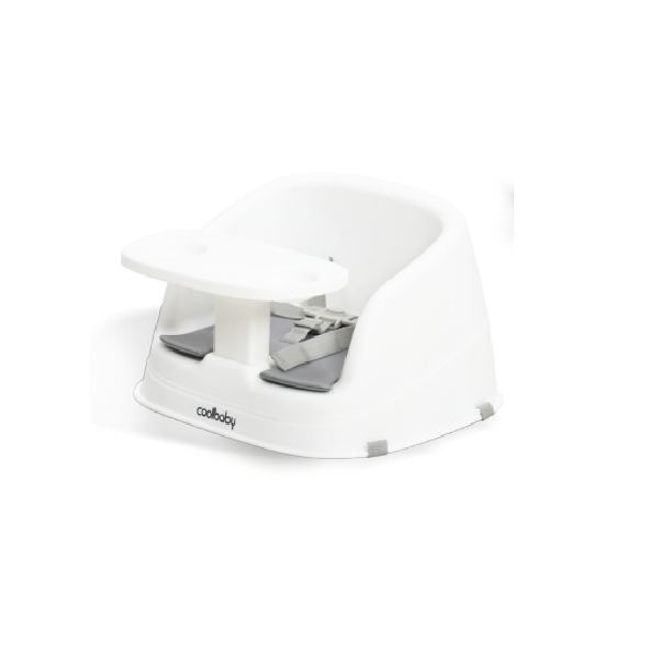 Safe infant seat with harness for babies sitting up. Removable BPA-free tray stores under the seat.