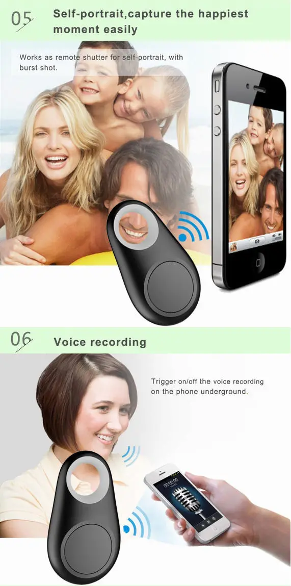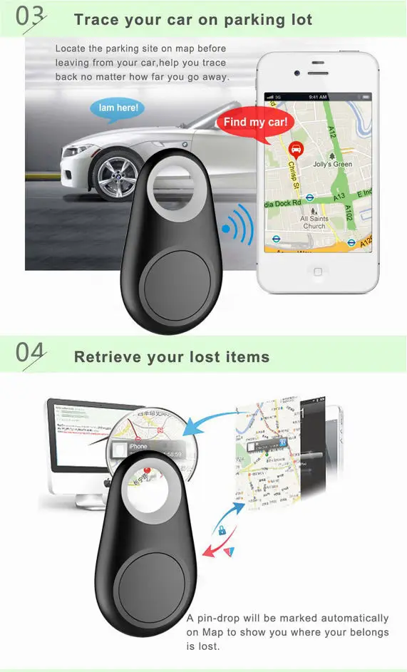 Funtions : Two-way anti-loss search Looking for cell phones Search for things with a mobile phone Map location Ble Low Energy / One Torch Find /Smart Remaind /Remote Camera/Bidirectinal Alarm /Location Lookup