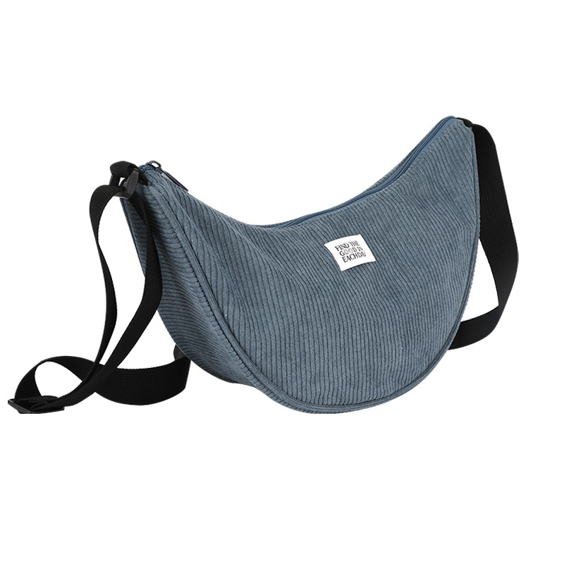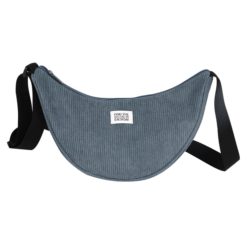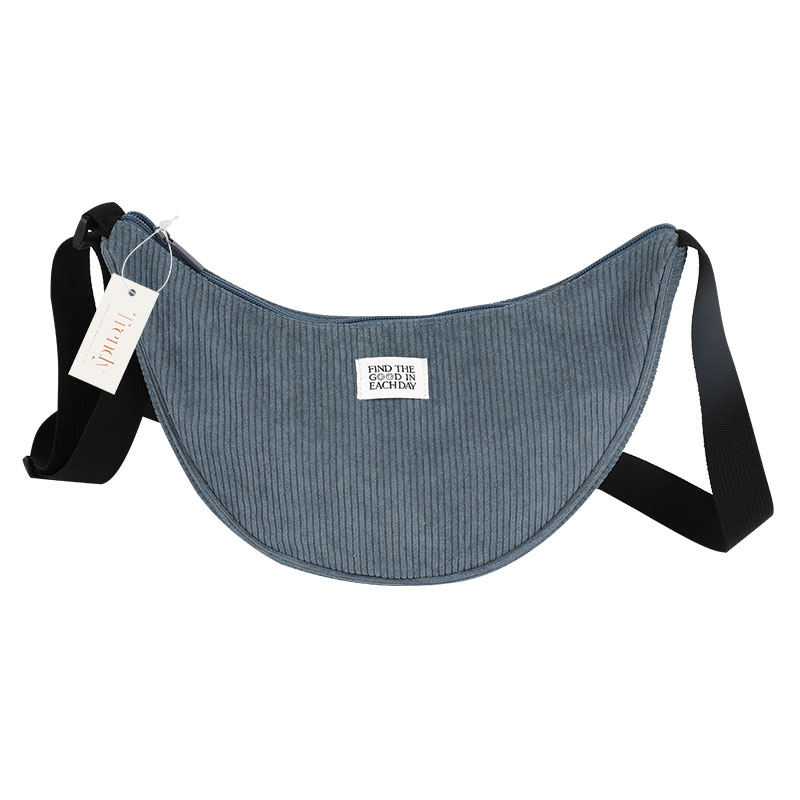 BUM BAG, 290*100*190MM, DARK BLUE CORDUROY BAG BODY, BLACK WEBBING SHOULDER STRAP, DARK BLUE TAPE AND ZIPPER.
