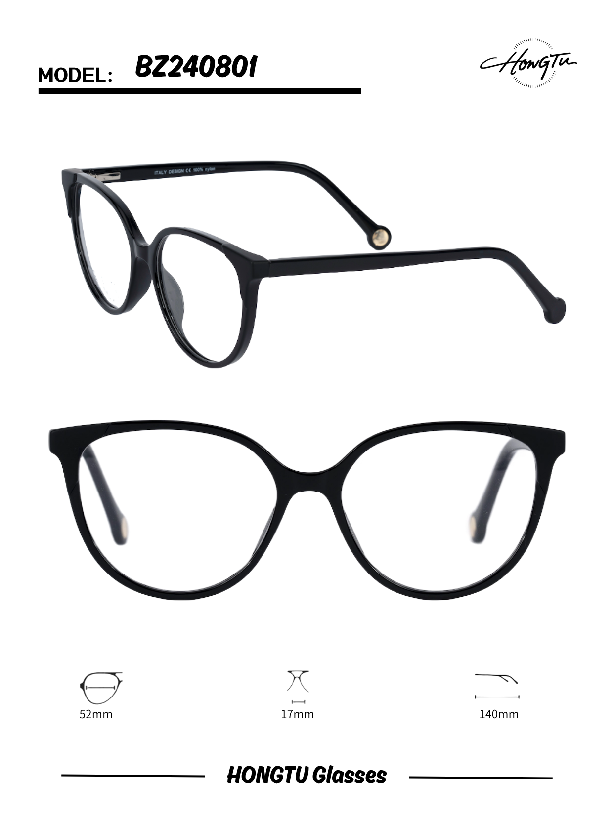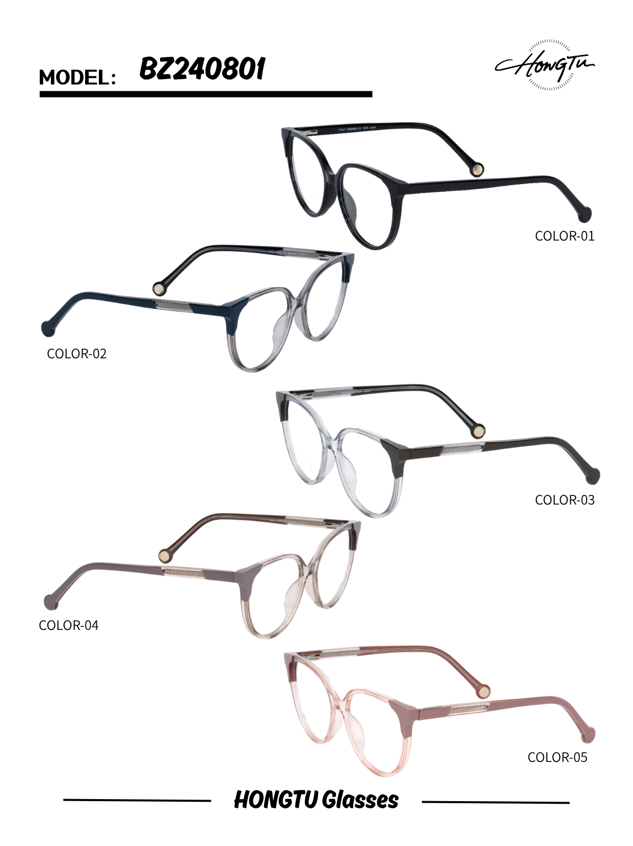 HONGTU Glasses Model BZ240801 features an elegant cat - eye frame design with unique metal detailing at the temple ends, available in five distinct color variants (COLOR-01 to COLOR-05). It has a frame width of 52mm, a bridge width of 17mm, and a temple length of 140mm, ensuring a comfortable and stylish fit. Combining classic aesthetics and meticulous craftsmanship, this model is an excellent choice for those seeking a fashionable and versatile eyewear option that blends elegance and individuality.