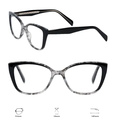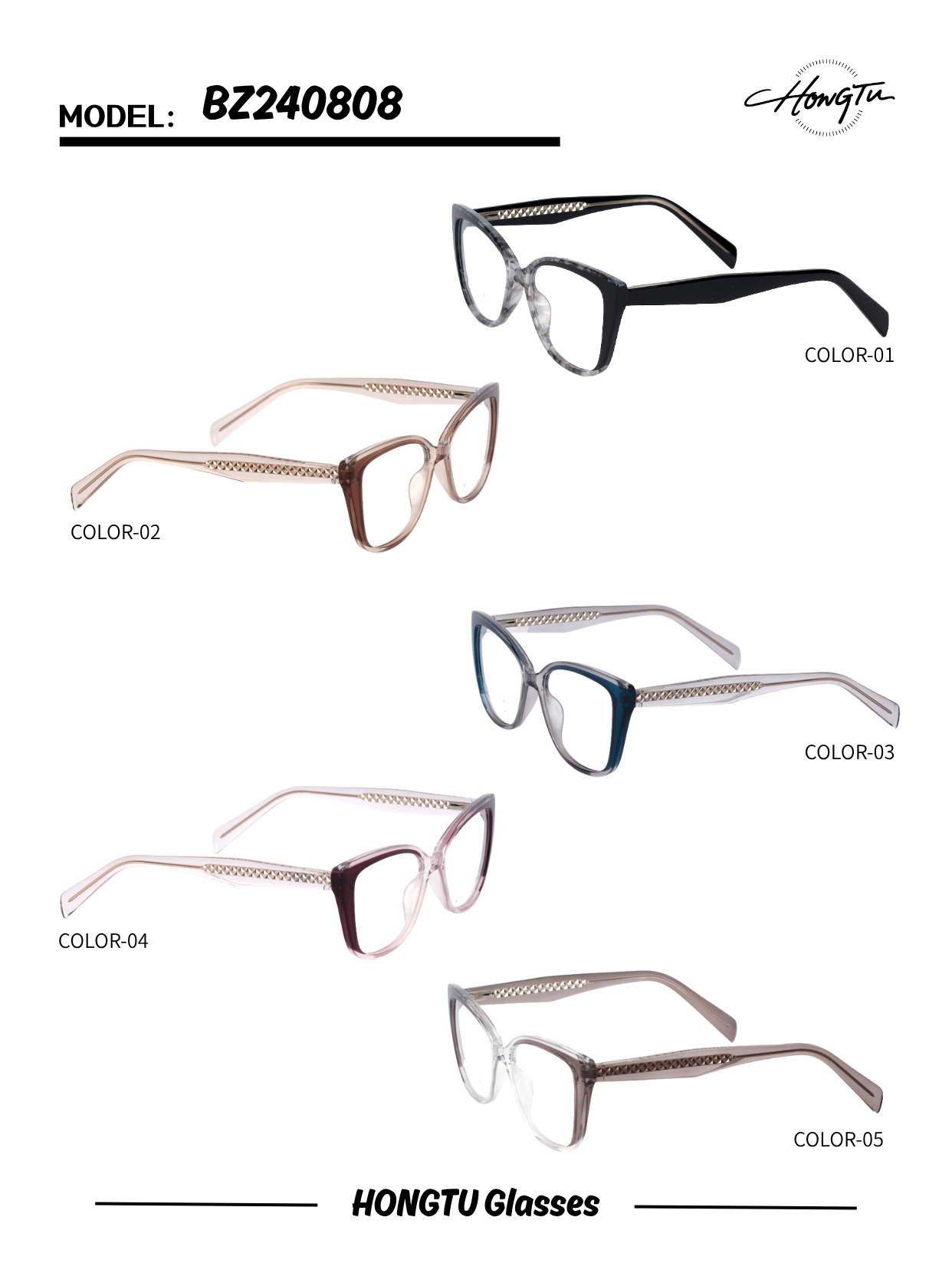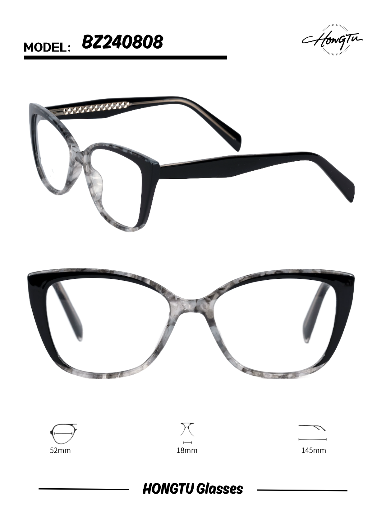 HONGTU Glasses Model BZ240808 features an elegant cat - eye frame design with intricate metal detailing on the temples, available in five distinct color variants (COLOR-01 to COLOR-05). It has a frame width of 52mm, a bridge width of 18mm, and a temple length of 145mm, ensuring a comfortable and stylish fit. Combining sophisticated aesthetics and meticulous craftsmanship, this model is an excellent choice for those seeking a fashionable and versatile eyewear option that blends elegance and individuality.