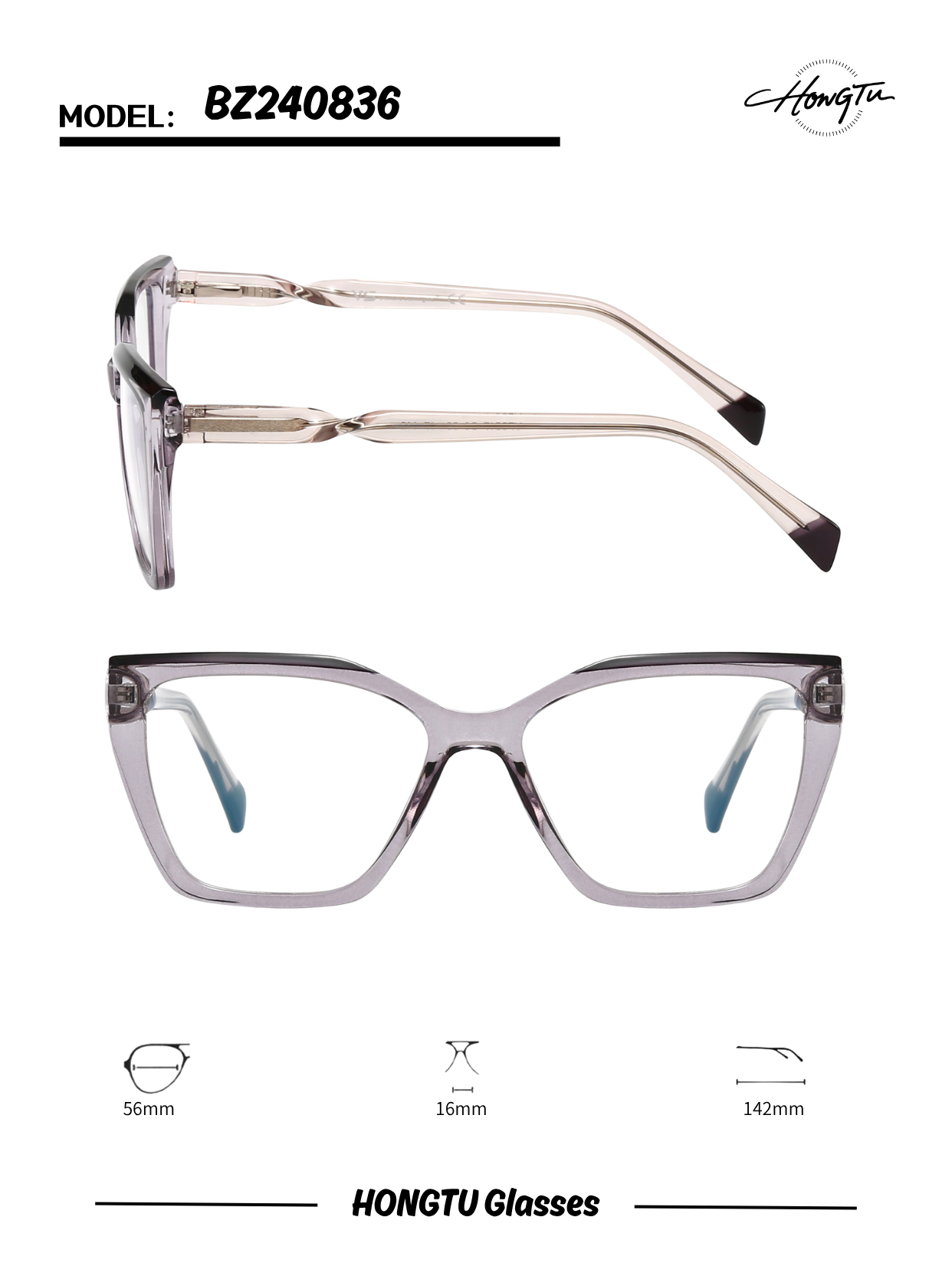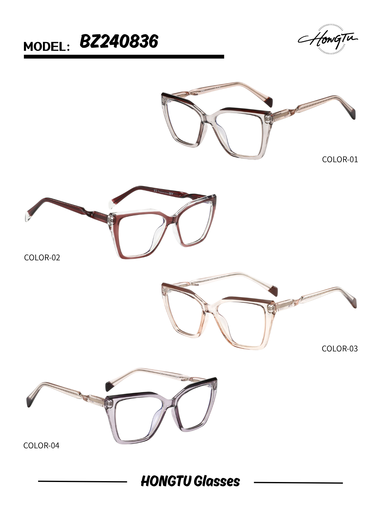 HONGTU Glasses Model BZ240836 features a modern cat - eye frame design with unique structural details on the temples, available in four distinct color variants (COLOR-01 to COLOR-04). It has a frame width of 56mm, a bridge width of 16mm, and a temple length of 142mm, ensuring a comfortable and stylish fit. Combining contemporary aesthetics and meticulous craftsmanship, this model is an ideal choice for those seeking a fashionable and versatile eyewear option that blends elegance and individuality.