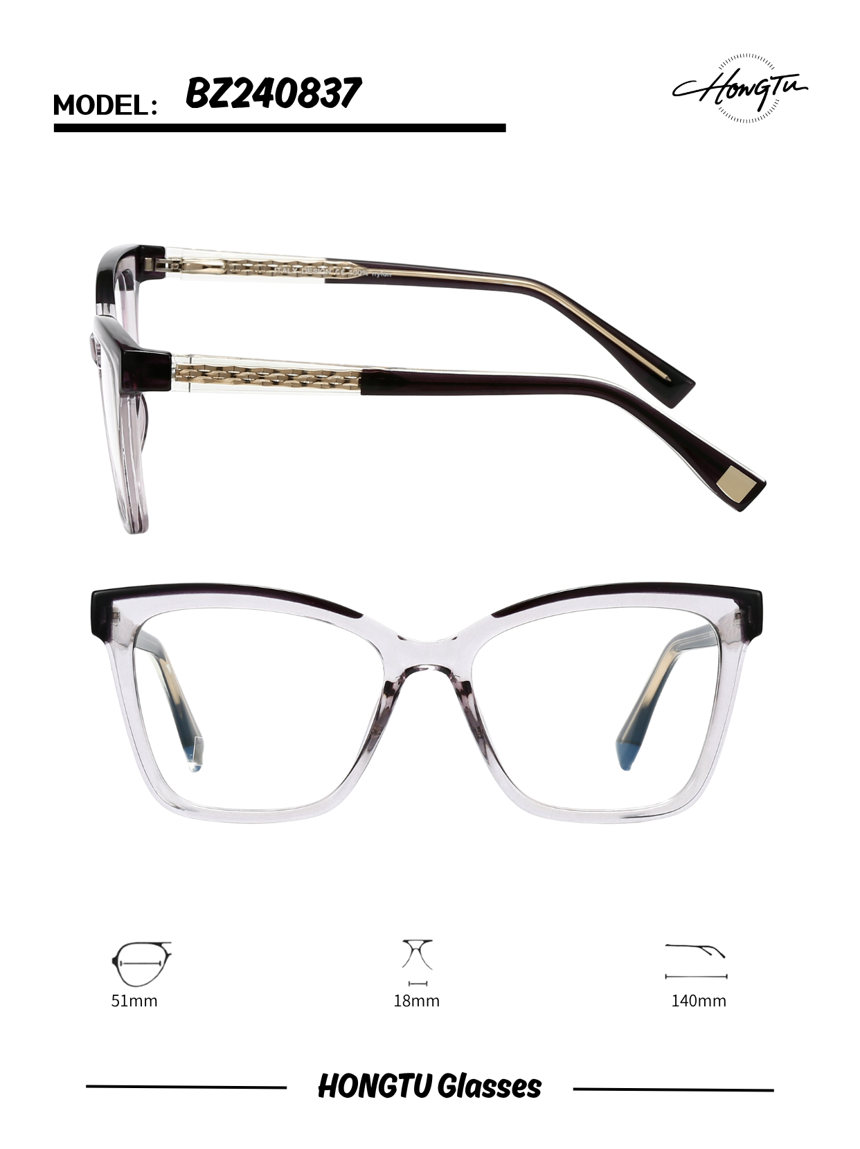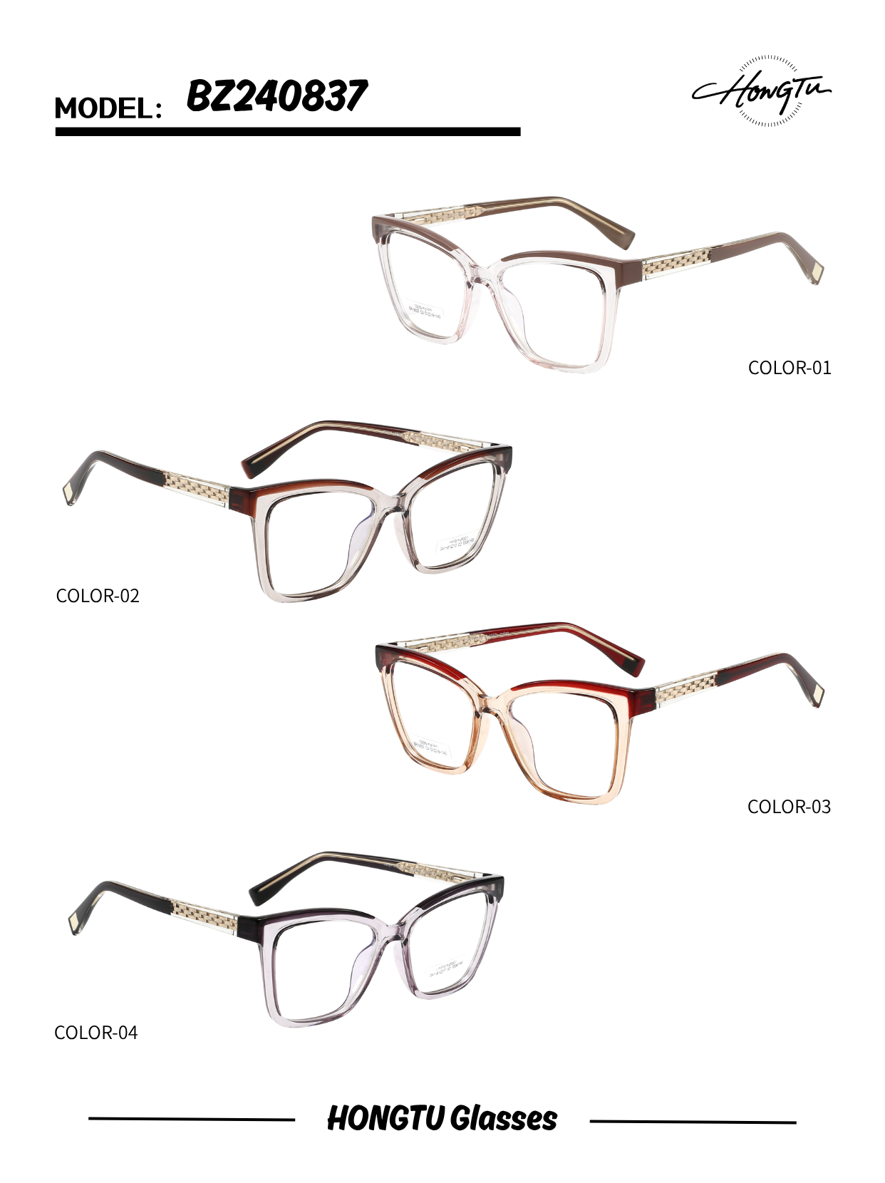 HONGTU Glasses Model BZ240837 features a stylish cat - eye frame design with intricate metal detailing on the temples, available in four distinct color variants (COLOR-01 to COLOR-04). It has a frame width of 51mm, a bridge width of 18mm, and a temple length of 140mm, ensuring a comfortable and stylish fit. Combining contemporary aesthetics and meticulous craftsmanship, this model is an ideal choice for those seeking a fashionable and versatile eyewear option that blends elegance and individuality.