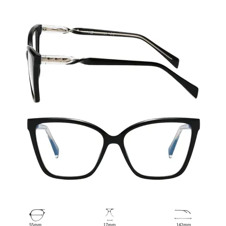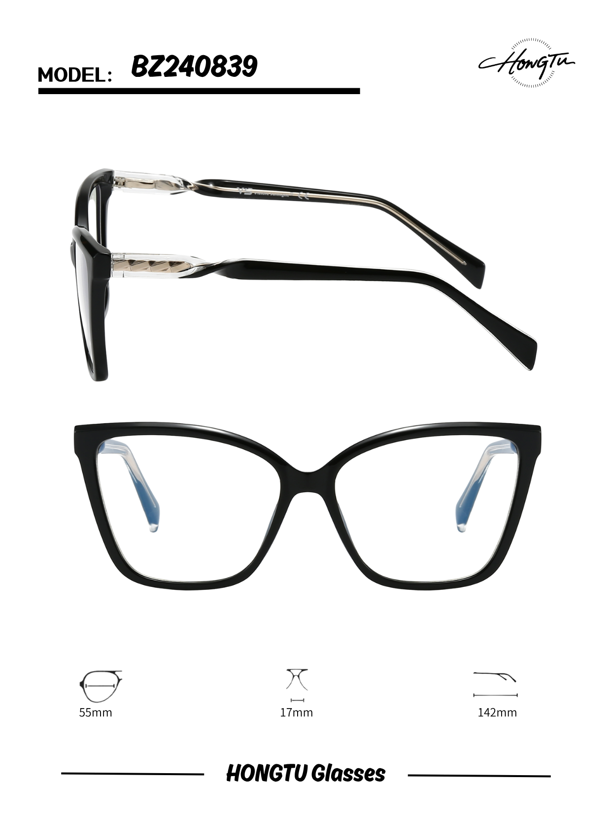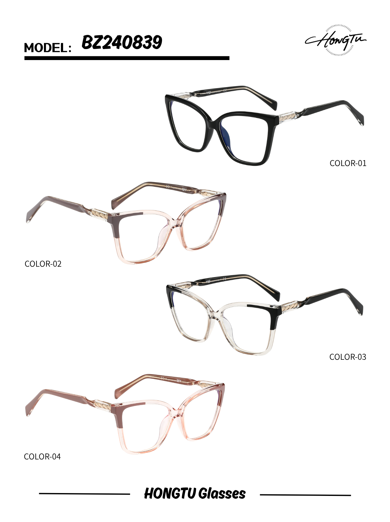 HONGTU Glasses Model BZ240839 features a modern cat - eye frame design with intricate metal detailing on the temples, available in four distinct color variants (COLOR-01 to COLOR-04). It has a frame width of 55mm, a bridge width of 17mm, and a temple length of 142mm, ensuring a comfortable and stylish fit. Combining contemporary aesthetics and meticulous craftsmanship, this model is an ideal choice for those seeking a fashionable and versatile eyewear option that blends elegance and individuality.
