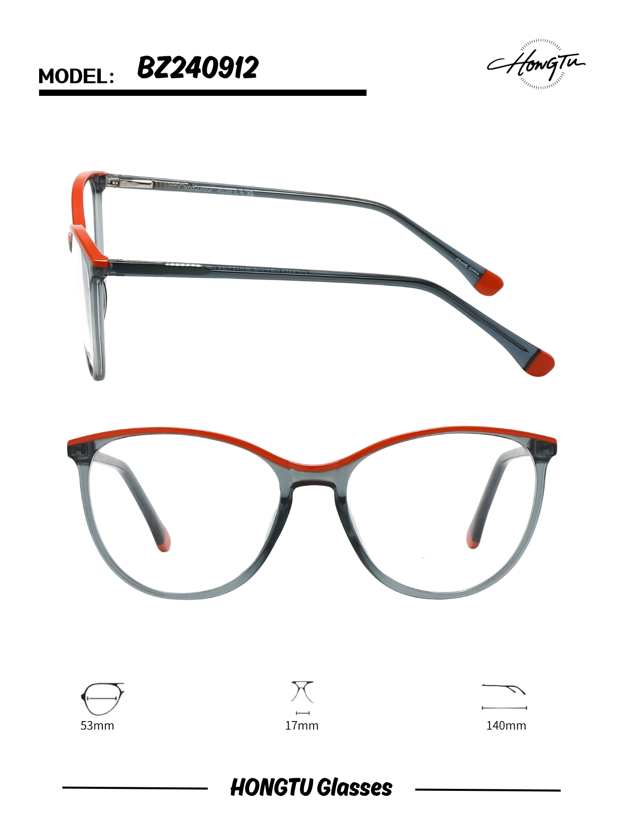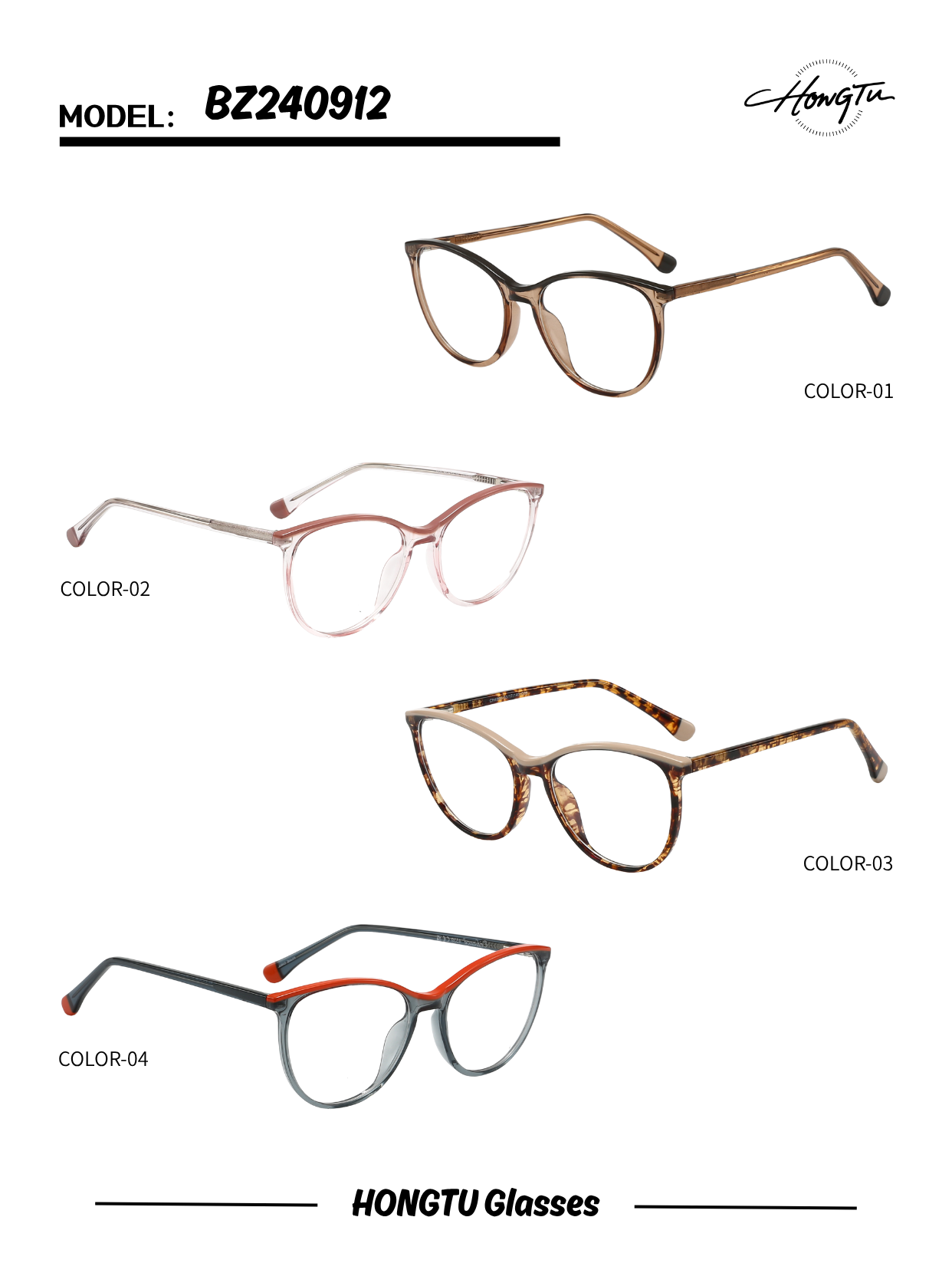 HONGTU Glasses Model BZ240912 features a fashionable cat - eye frame design, available in four distinct color variants (COLOR-01 to COLOR-04). It has a frame width of 53mm, a bridge width of 17mm, and a temple length of 140mm, ensuring a comfortable fit. Combining stylish aesthetics and practical wearability, this model is an excellent choice for those looking to add a touch of elegance to their look.