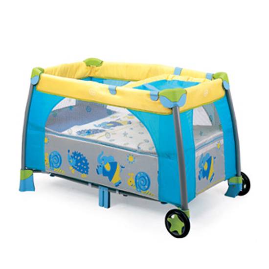 This product is a babies cot featuring colourful mesh walls. The mesh walls prevent claustrophobia and add to the nursery's aesthetic appeal. The mesh is coloured in a baby blue and yellow colourscheme and is a colourful and delightful addition to any home to a new baby.