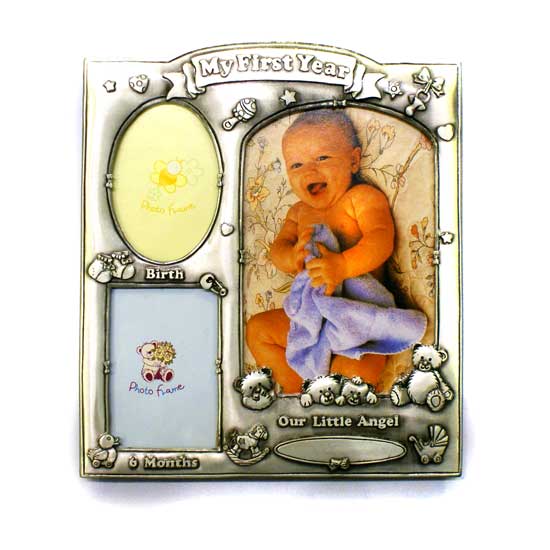 This babies' photo frame boasts a unique design. It features three photo slots in various shapes. The frame is uniquely adorned with embossed patterns. It makes a perfect gift for families with newborn babies.