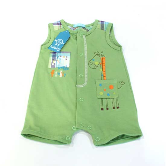 This is a lovely babies' romper suit with a sleeveless cut. The romper is green in color, with cute giraffe embroidery added on the pocket. Checked fabric is added on the shoulders for extra style. A full button closure is added to allow easy changing.