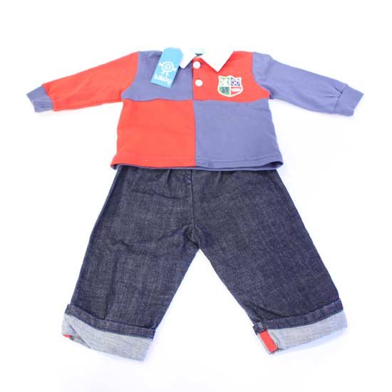Featured is a set of babies' long-sleeve shirt and jeans with a cute design. The shirt looks exceptionally smart in a red-and-purple match, with a pointed collar. The jeans are made of quality cotton for a soft texture.