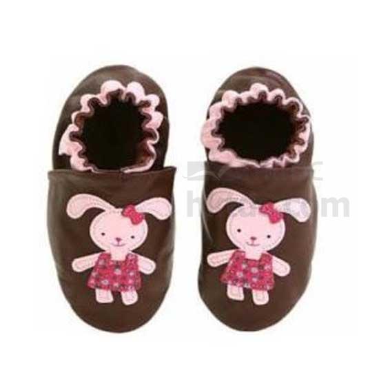 Showcased is a pair of babies' shoes with elastic fastening. The soles are made of leather to provide great comfort. The shoes are designed in brown, with pink patched rabbits added on the uppers.