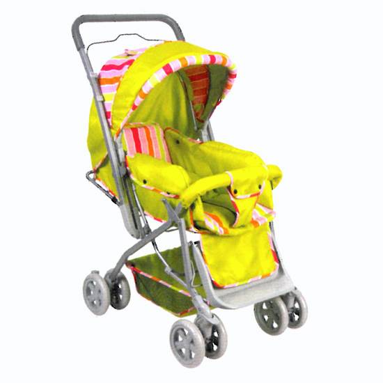 Featured is a foldable babies' stroller with a reversible handle. The stroller is easy to carry after being folded. The backrest can be adjusted to 4 positions. The stroller comes with a basket and a canopy.