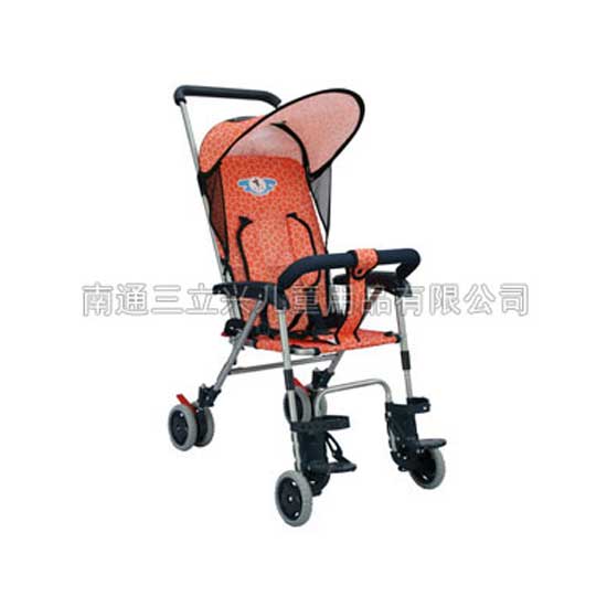 Highlighted is a babies' stroller in thoughtful design. The round canopy provides satisfactory shading for the baby. The front bar and safety harness prevents easy fall-off. The foldable design enables space-saving storage.