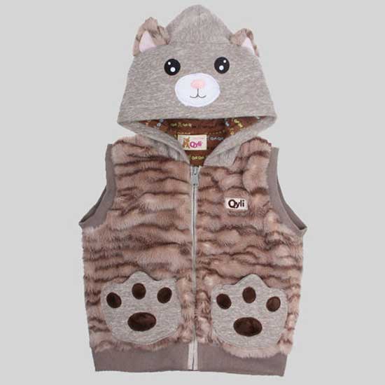 Displayed is a babies' vest that comes in a cute design. The hood is decorated to look like the head of a bear while the body is made of furry material for a smooth feel. This sleeveless vest is comfortable and warm.
