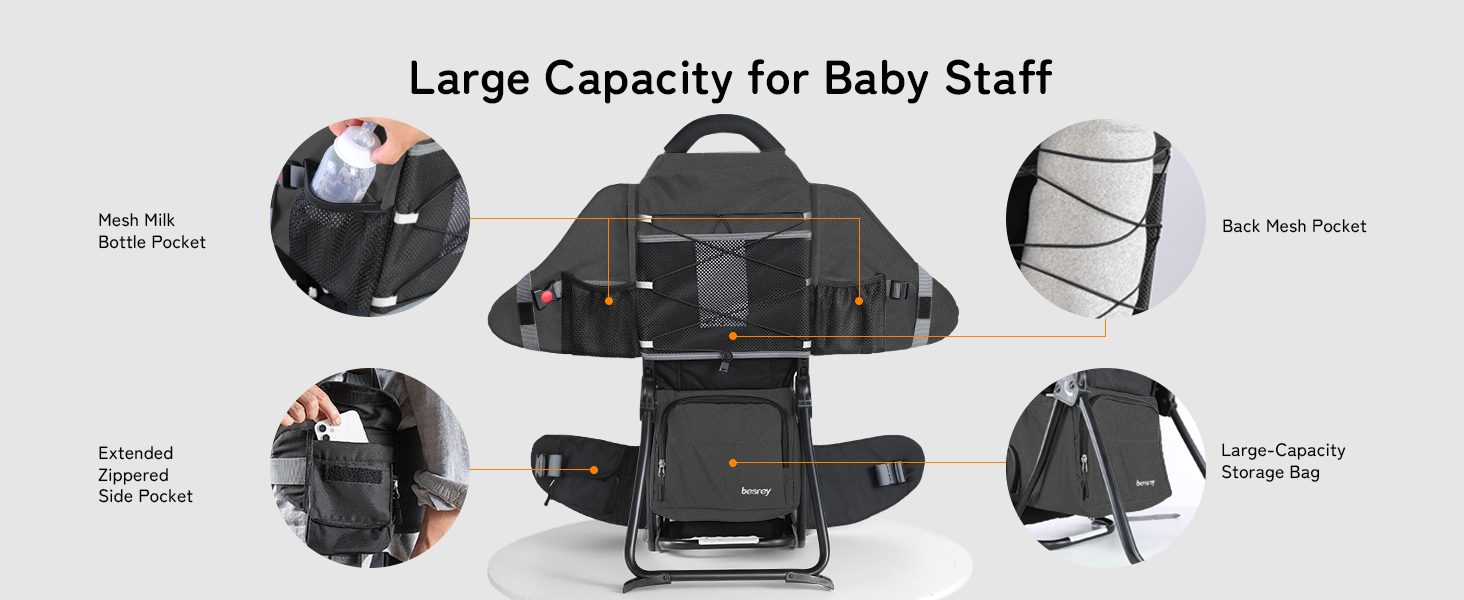 Multiple Storage Space:The Besrey kids carrier has a lot of pocket space, including a big bottom storage compartment for diaper wipes and a water container. There is an extendable zipper compartment and two large mesh pockets on the side of the belt to meet your storage requirements and firmly attach your carry-on items.