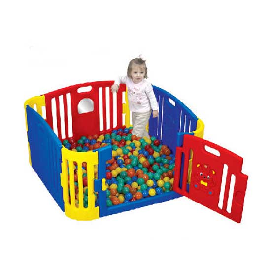 This baby bear zone with soft balls flaunts a red, yellow and blue toned design for a vibrant touch. The wall can be extended by adding sidewalls for added fun. The locking device on the door guarantees kids’ safety when playing.