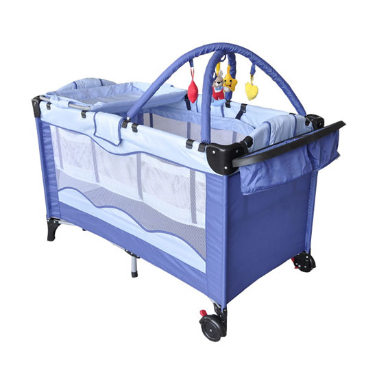 This functional baby bed features foldable rectangular construction. The frame of the bed is made from coated steel tube and covered with 150D oxford fabric. It also equipped with accessories like the diaper-changing table, side basket and toy bar for added functionality.