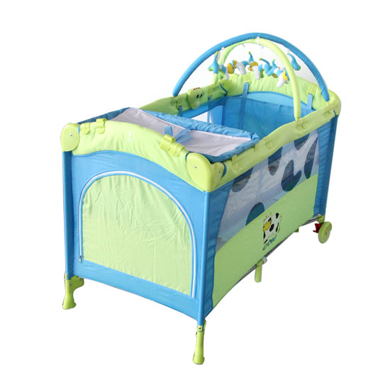 This baby bed comes in bright, soothing colors of green and blue. It is designed with two toy bars and toys to delight children. A change table, music and vibrations toys are also included in the bed.