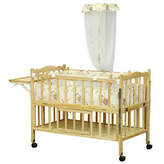 This is a baby bed with a highly durable wooden structure. It features two tiers and is equipped with wheels for easy movement. The front bed rail can be folded down for added utility.