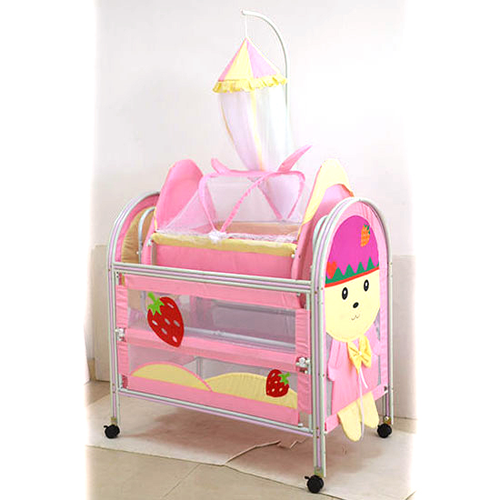 This is a baby bed with a sweet and cute appearance suitable for girl babies. It features a durable frame, robust fabric, and a matching mosquito net. The lovely cartoon and strawberry patterns highlight this design for a more attractive look.