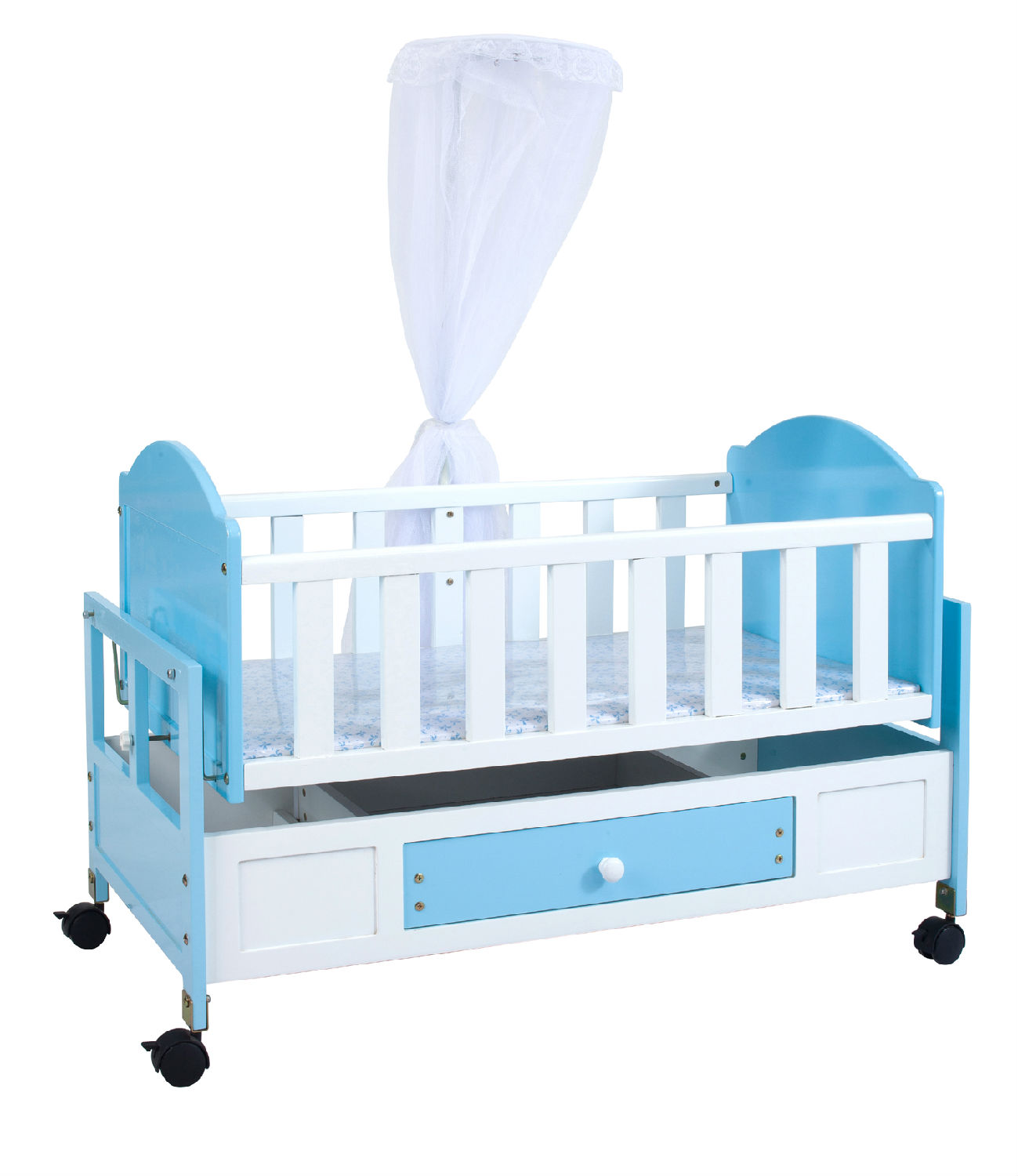 This product is an adorable, blue and white bed designed to create a cozy haven for the little one. It comes equipped with convenient wheels for easy room-to-room mobility. The bed also features a spacious drawer underneath, providing extra storage for baby essentials like blankets, diapers, or toys. A comfortable and secure addition for any family with a baby.